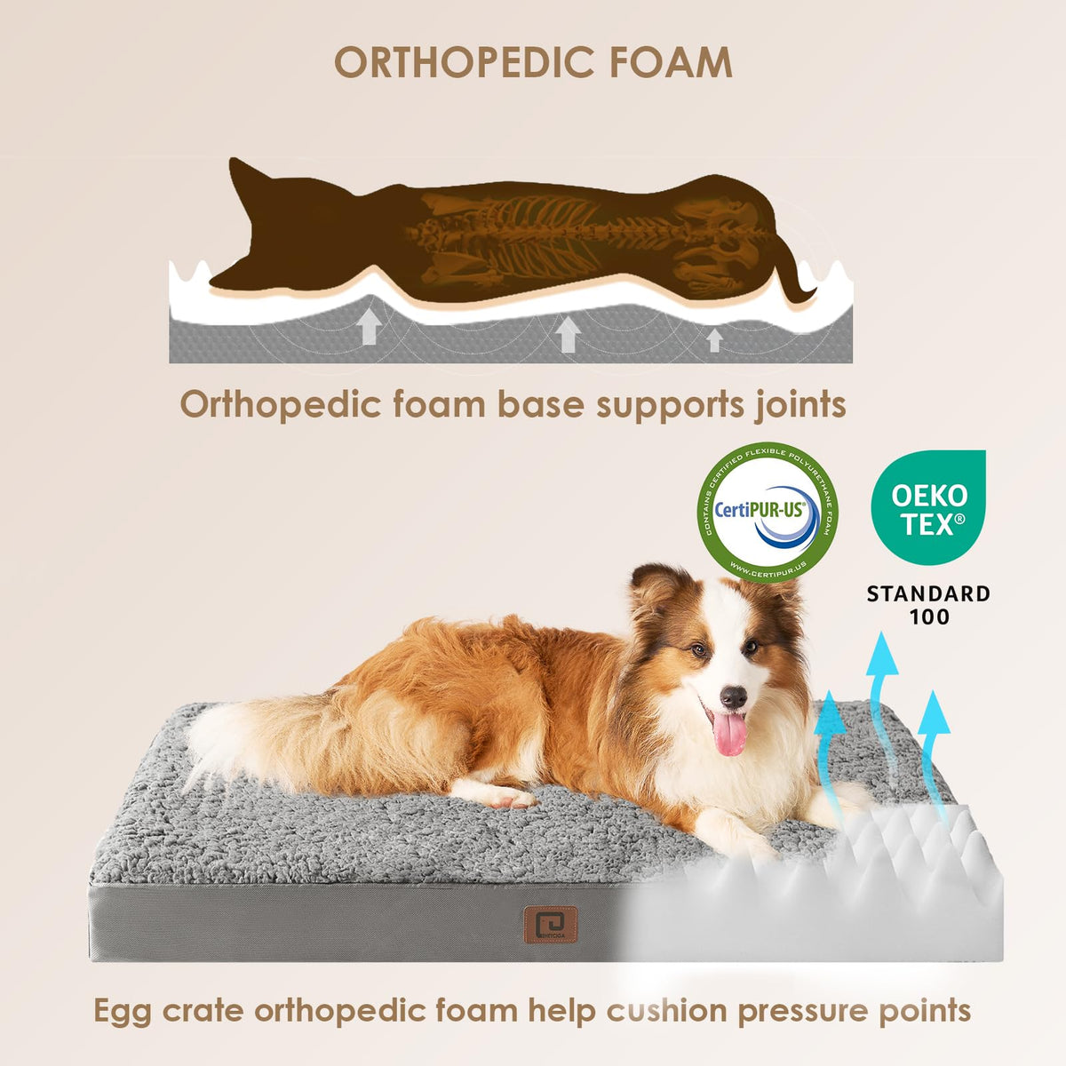 Q: What materials are used in the EHEYCIGA Orthopedic Dog Bed?A: The dog bed is crafted from high-quality polyester with a plush sherpa top for ultimate softness and a non-skid bottom to prevent slipping, ensuring a cozy and secure sleeping environment for your pet.