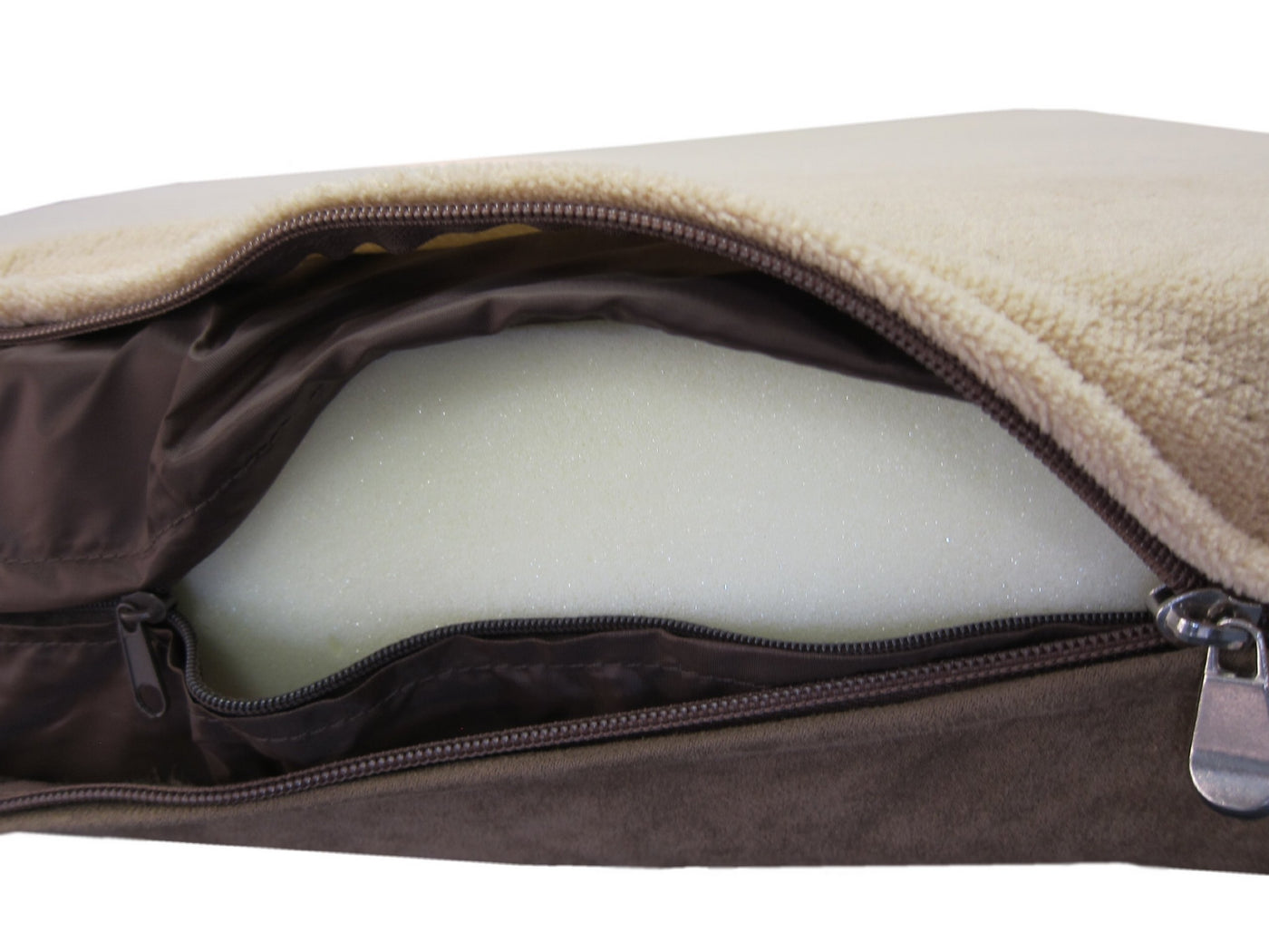 2 External covers : Coral Fleece external zipper cover in Beige color on top and Microfiber suede fabric in coffee brown color at bottom side (size 44''X39'' flat cover size). The memory foam is secured by Waterproof internal zipper cover. Machines Washable external covers.