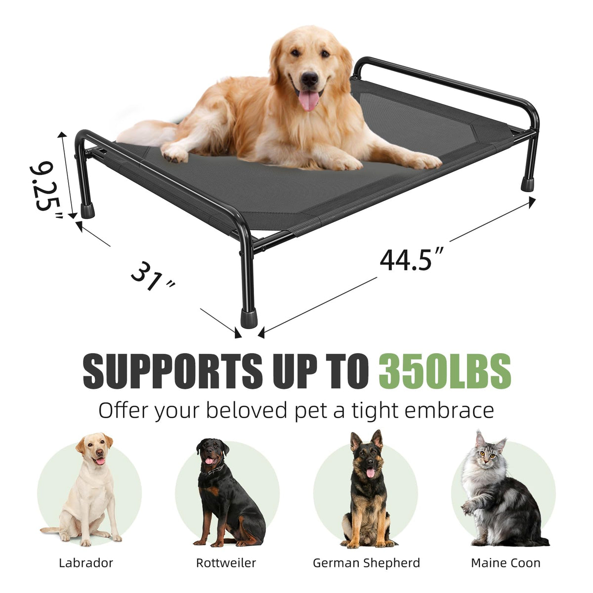Ekisemio Elevated Dog Bed - Premium Raised Outdoor Pet Cot for Large Dogs. Give your furry friend the ultimate comfort with the Ekisemio Elevated Dog Bed-designed for large and extra-large dogs (up to 350 lbs). Whether indoors or outdoors, this sturdy, waterproof pet cot provides superior support, keeping your pup cool, dry, and comfortable in any weather.Ekisemio Raised Elevated Dog Bed, Outdoor Dog Beds for Medium and Large Dogs, Cooling Pet Cot up to 350LBS, Waterproof Mesh Cover Heavy-Duty Metal Frame, Anti-Slip Feet, 44.5L x 31W x 9.25Th, Black