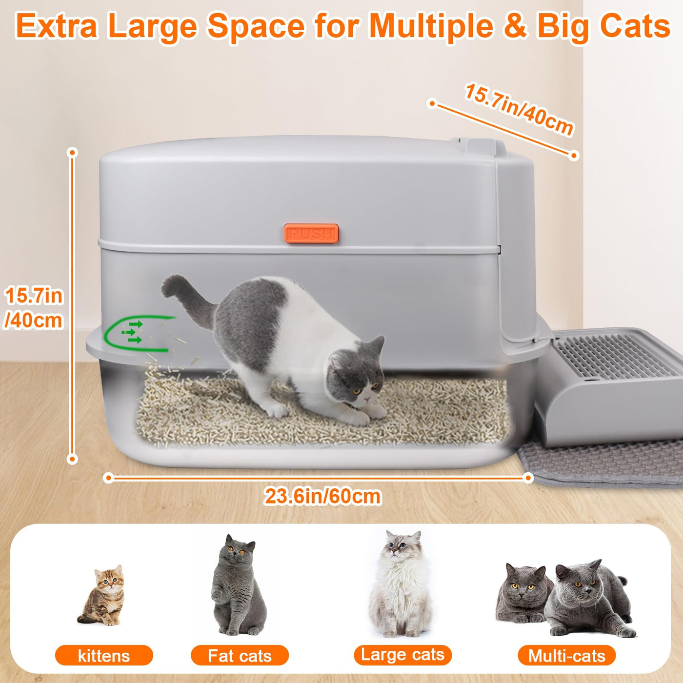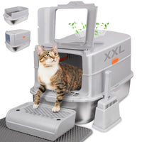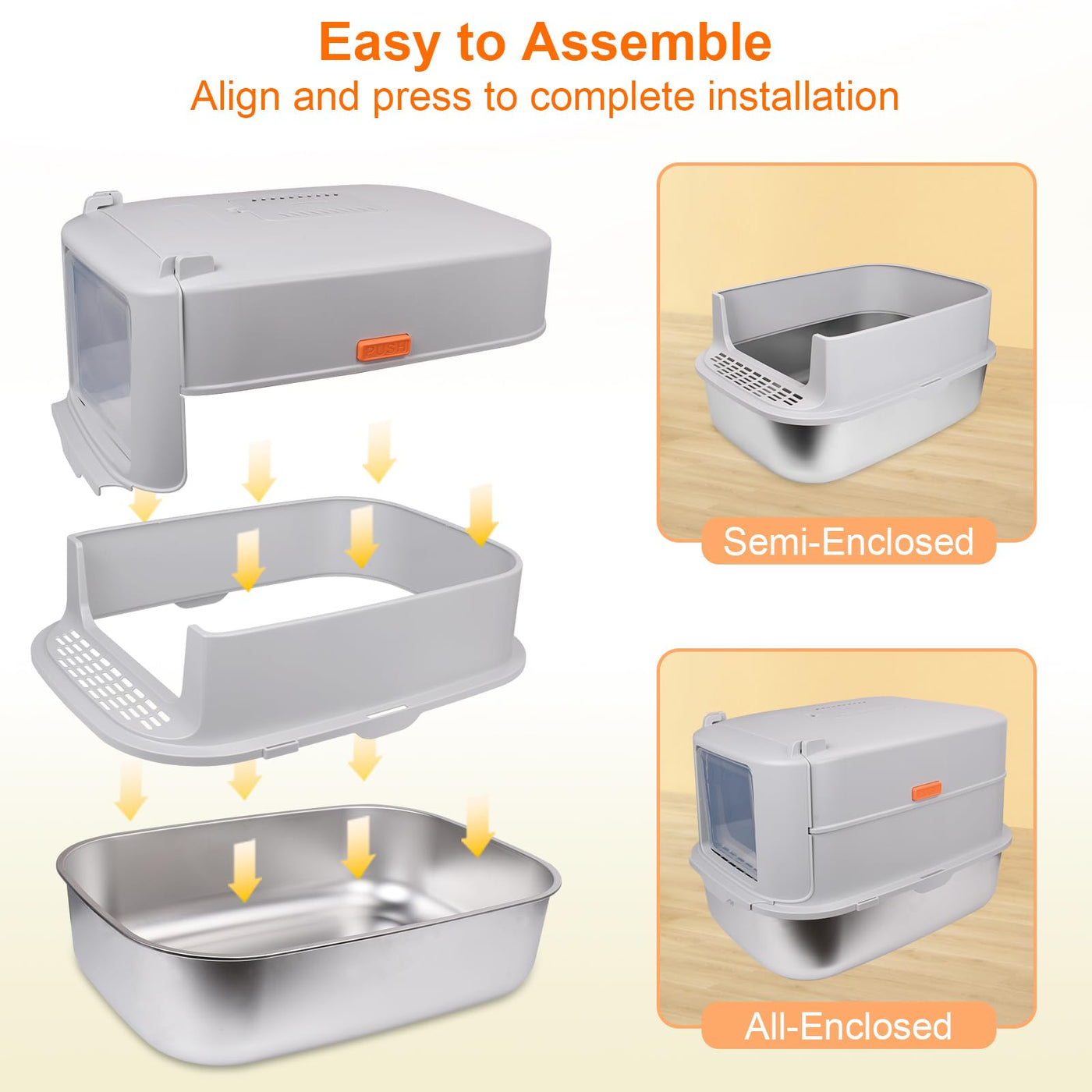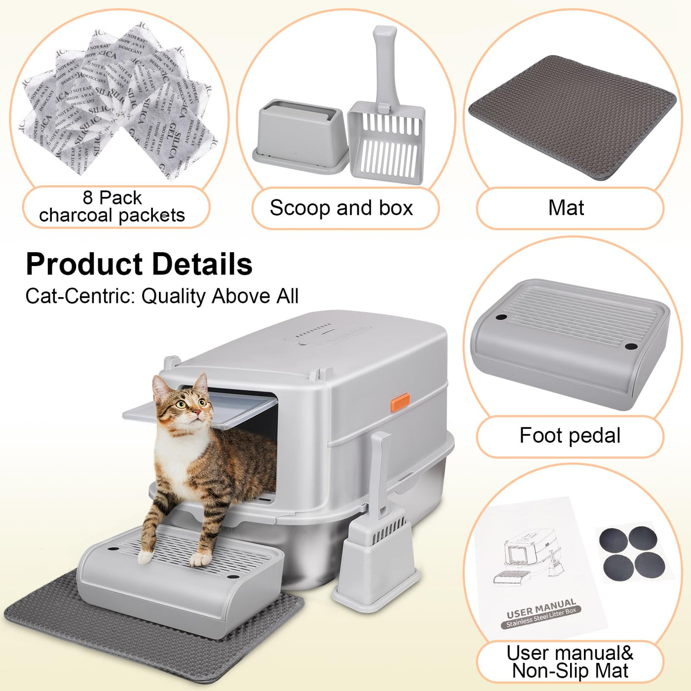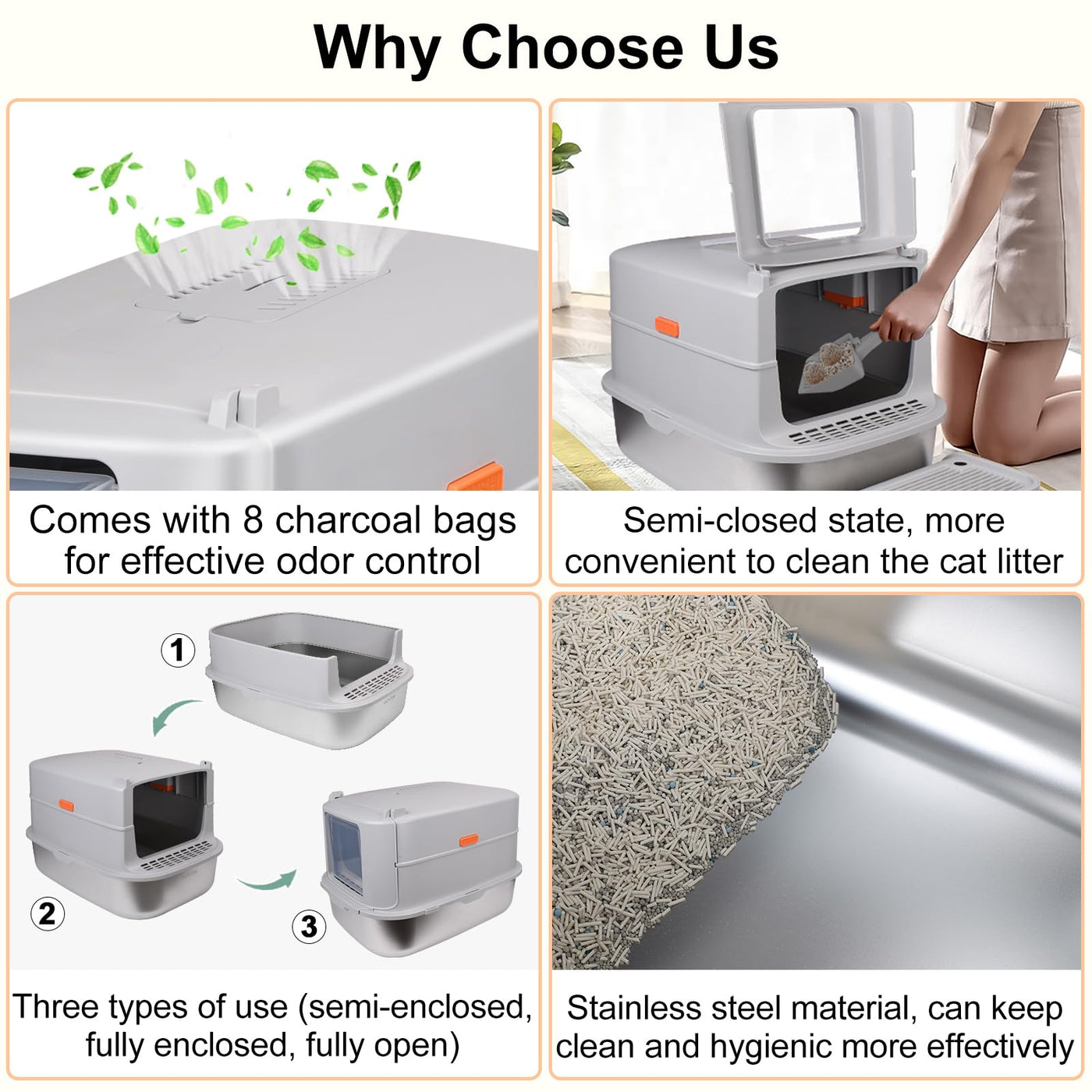 Elegx Odor-Control Stainless Steel Cat Litter Box,Xl Large 4-In-1 Cat Metal Litter Box Set,Enclosed Removable Metal Litter Box W