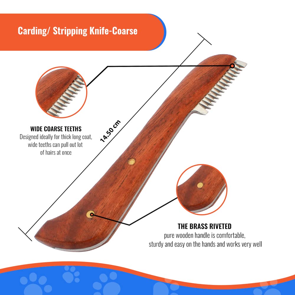 Elmax Stripping Knife Set Are Made From The Finest Quality, Heat Treated German Stainless Steel. Blades Are Extremely Light Weight, Anti Rust And Durable. These Professional Hand Stripping Knife For Dogs Are Great For Maintaining Overall Body/Jacket And Used To Remove Excess/Dead Undercoat And Final Finishing Assisting With The Look You Want. The Stainless Steel Blade Extends Through The Entire Length Of Stripping Knife Giving Maximum Strength And Durability. The Elmax Hand Stripping Tools Dogs Are Very Well Designed To Fit Into Your Hand Like It Was Built Especially For You, Ergonomically Brass Riveted Handles Are Designed For Extra Comfort, Durability And Better Grip. This Professional Stripping Knives Dog Grooming Set Is Designed For The Grooming Professionals As Well The Pet Owners. This Set Includes 6 Stripping Knives Namely, Carding Stripping Knife Medium, Carding Coarse Knife, European Extra Fine Knife, Detailing Knife 3In1, Terrier Knife-Fine And English Knife Coarse All In Right Handed Stripping Knife. These Pet Stripping Comb Can Also Be Used As A Rake Knife To Remove Undercoat.