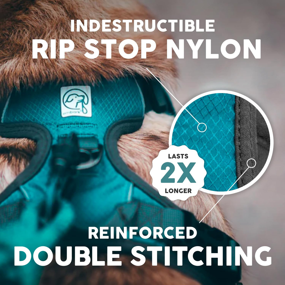 Q: What materials are used in the construction of this dog harness?A: The Embark Adventure XL Dog Harness is made from high-quality, no-rip nylon, ensuring durability for outdoor activities. It features anti-chafe padding for added comfort and is constructed with quadruple stitching and military-grade thread for enhanced strength and longevity.