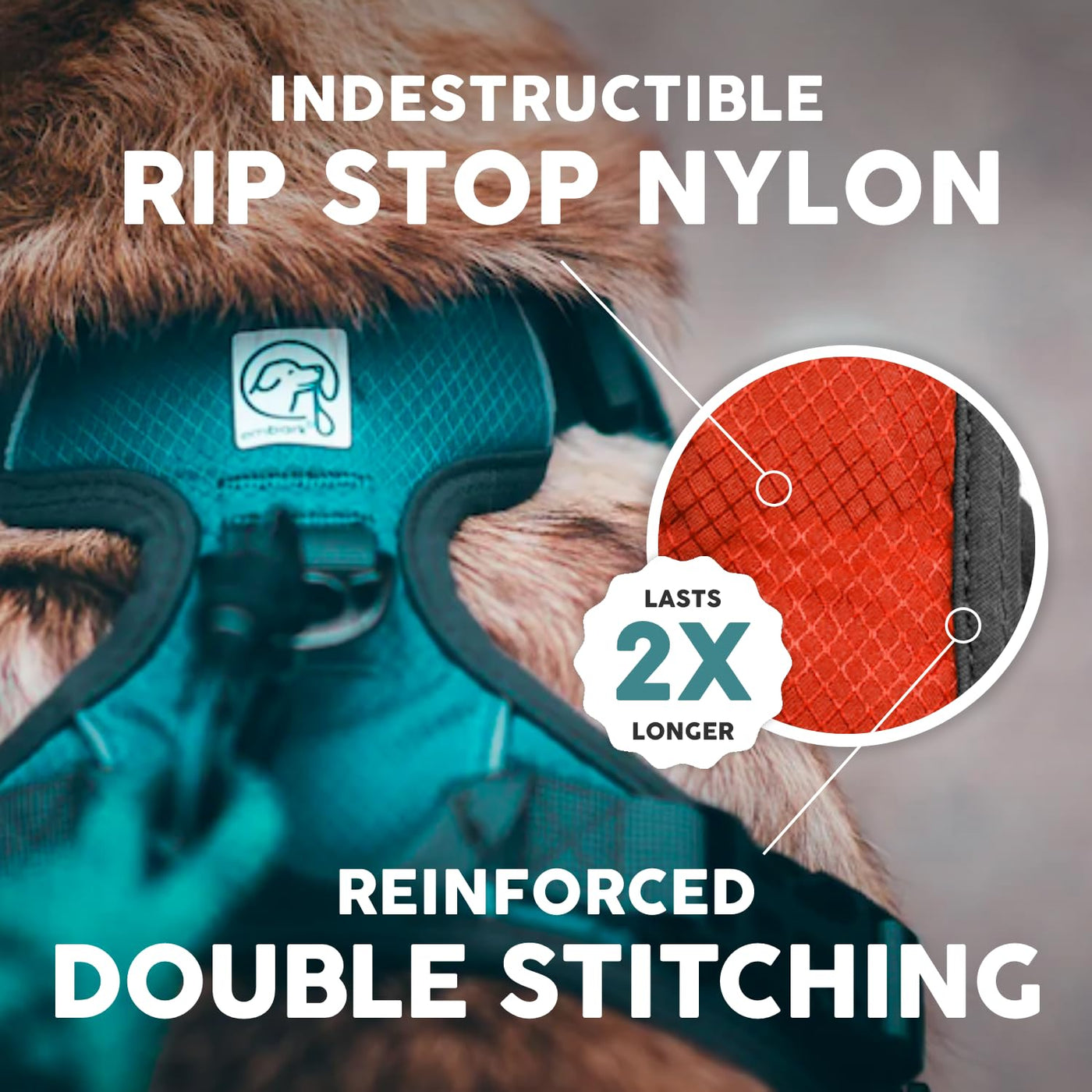 Q: What materials are used in the construction of the harness?A: The harness is made from durable, no-rip nylon and features anti-chafe padding for added comfort. It is reinforced with quadruple stitching and military-grade thread, ensuring it can withstand the pulling strength of large dogs.