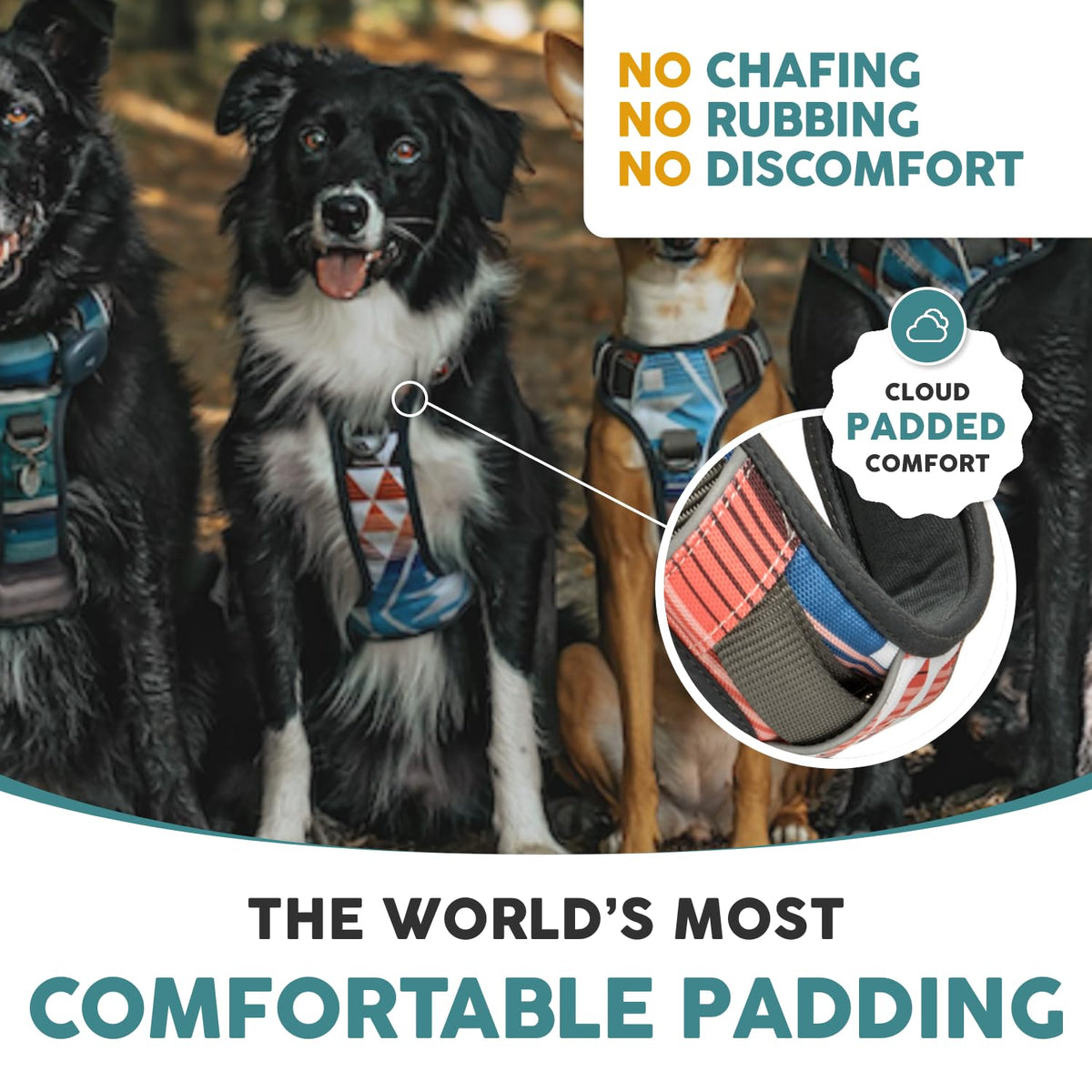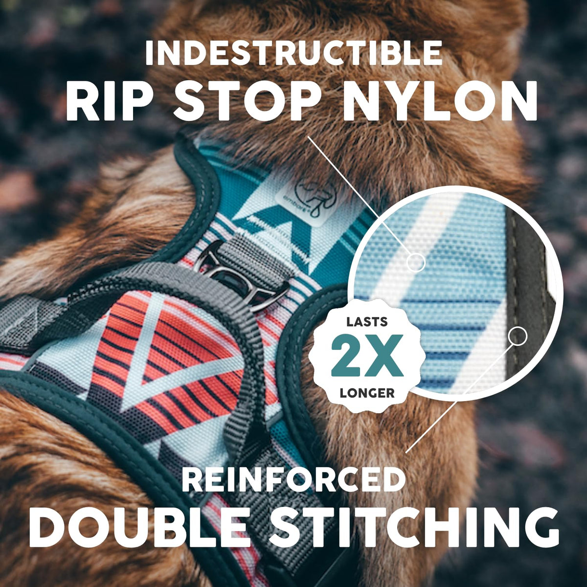 - Durable, high quality materials - Anti chafe padding for comfort - Quadruple Stitching and military grade thread for durability - 2 modes - Front Clip Dog Harness No Pull (front range Training mode) and back attachment - Reflective trim for nighttime visibility - Customizable sizing for secure fit - Handle for additional assistance control and lifting if your dog is senior, elderly, disabled or recovering from injury or a service dog