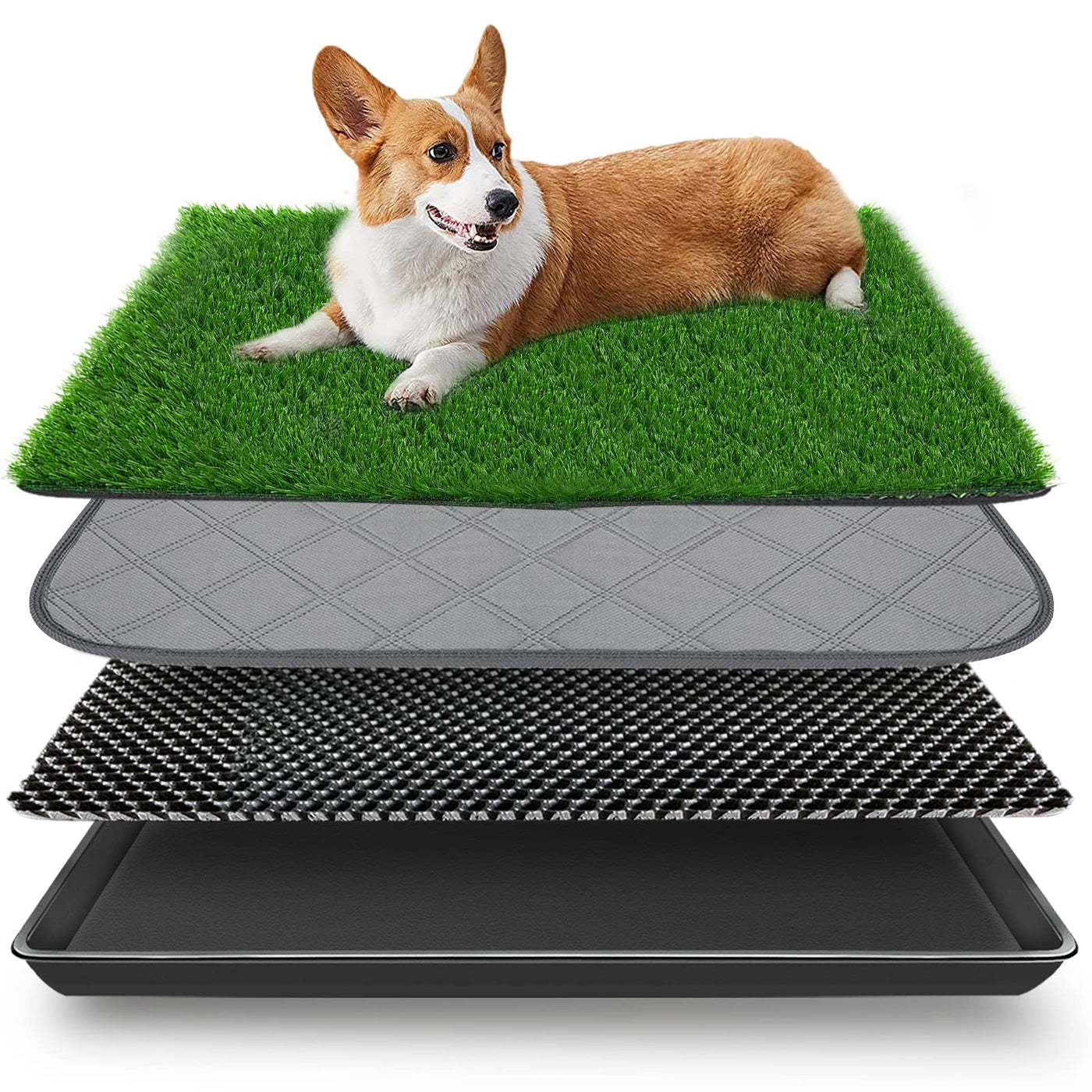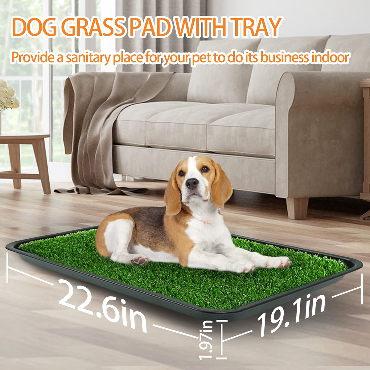 Q: What are the dimensions of the dog grass pad and tray?A: The dog grass pad measures 22.6 inches by 19.1 inches, providing ample space for various dog sizes. The tray is designed to be leak-proof, ensuring cleanliness during use.