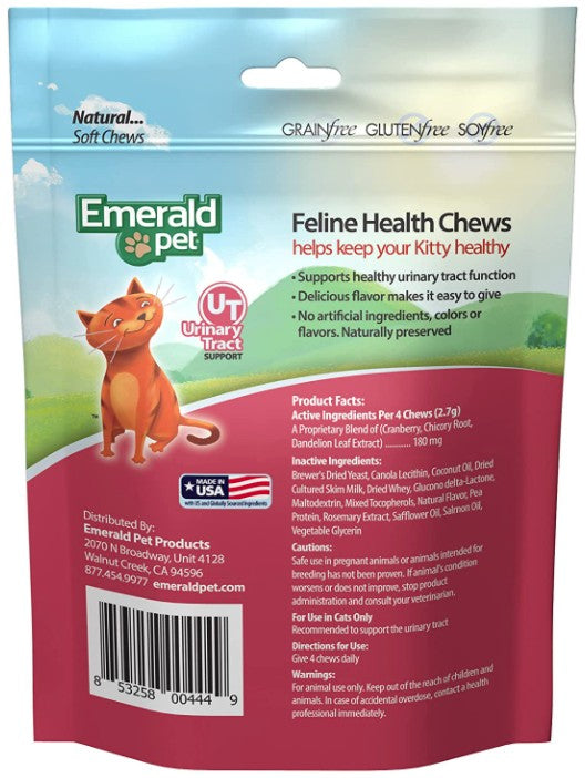 Emerald Pet Feline Health natural chews have a soft, moist texture with a taste cats love. Health benefiting ingredients like cranberry, chicory root, papain, and bromelain help aid digestion and keep your kitty healthy. Designed to promote digestive health for common cat issues and keep them smiling for years to come. Made in the USA from only the finest ingredients. No artificial ingredients, colors, or flavors. Naturally preserved.Made in the USAGrain free, gluten-free, and soy freeIncludes cranberry, chicory root and dandelion leafDelicious flavor makes it easy to giveMaintains normal function of the urinary tractActive Ingredients Per 4 Chews (2.7g): A Proprietary Blend of (Cranberry, Chicory Root,Dandelion Leaf Extract) -180 mgInactive Ingredients: Brewers Dried Yeast, Canola Lecithin, Coconut Oil, Dried Cultured Skim Milk, Dried Whey, Glucono delta-Lactone, Maltodextrin, Mixed Tocopherols, Natural Flavor, Pea Protein, Rosemary Extract, Safflower Oil, Salmon Oil, Vegetable Glycerin