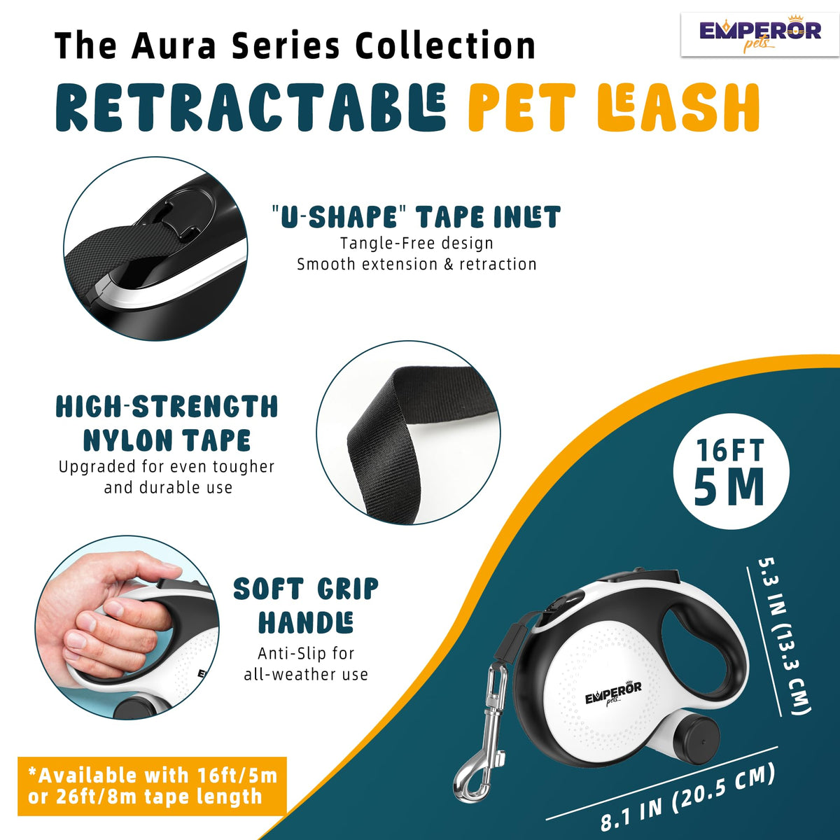 Emperor Pets 16 Ft Retractable Dog Leash White - Heavy Duty Retractable Pet Leash With Anti-Slip Grip - Reflective Dog Leash Tap