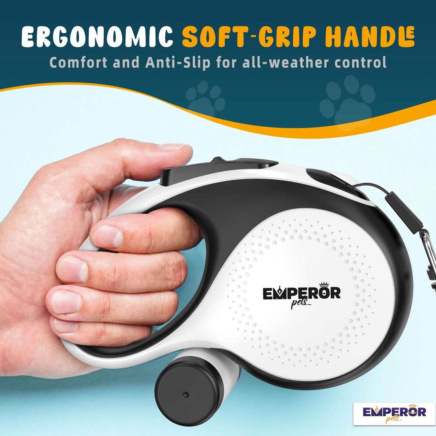 ? Strong & Durable ?Tough Retractable Dog Leash 16Ft - Strong Big Dog Leash Large Dogs, Suitable For Medium To Large Breeds Up To 110Lbs! Choose 16 Or 26 Ft Retractable Dog Leash Large Breed ? Simple & Easy ?One Button Lock & Release - Easy Full Control Gives Your Pet More Freedom To Roam! Great Long Dog Leash Retractable Leash Large Dog Leash Heavy Duty. 2 Color Choices - Black And White ? Perfect For Outdoor Use ?For Walks, Jogs Or Hikes - Great Dog Leads For Walking! Anti-Slip Handle For Great Grip Control - Great Retractable Dog Leash For Large Dogs, Dog Leashes For Medium Dogs ? Tough & Top Quality ?Upgraded 360 Tangle Free, Durable Nylon Tape & Rust-Proof Swivel Hook. Tough Internal Coil Spring For Consistent Retraction. One Of Best Dog Retractable Leash, Leash For Medium Dogs And Strong Dog Leash ? 100% Satisfaction ?If You Are Looking For A Heavy Duty Dog Leash For Large Dogs Or A Quality Long Leash For Dogs Outside, Look No Further! All Of Emperor Pets Dog Retractable Leashes For Large Breed Dogs Include Great Support - Contact Us Anytime, We Are Happy To Help!