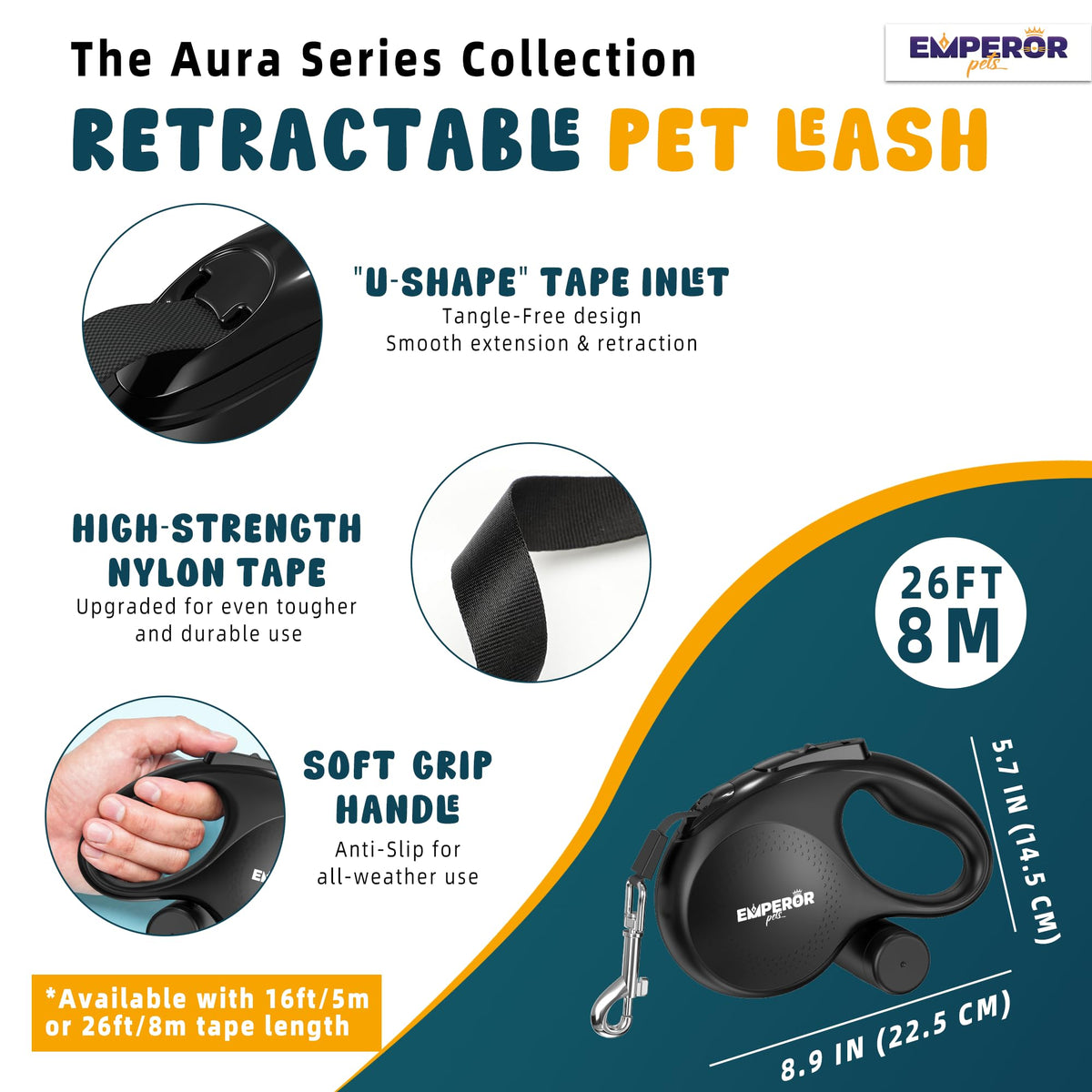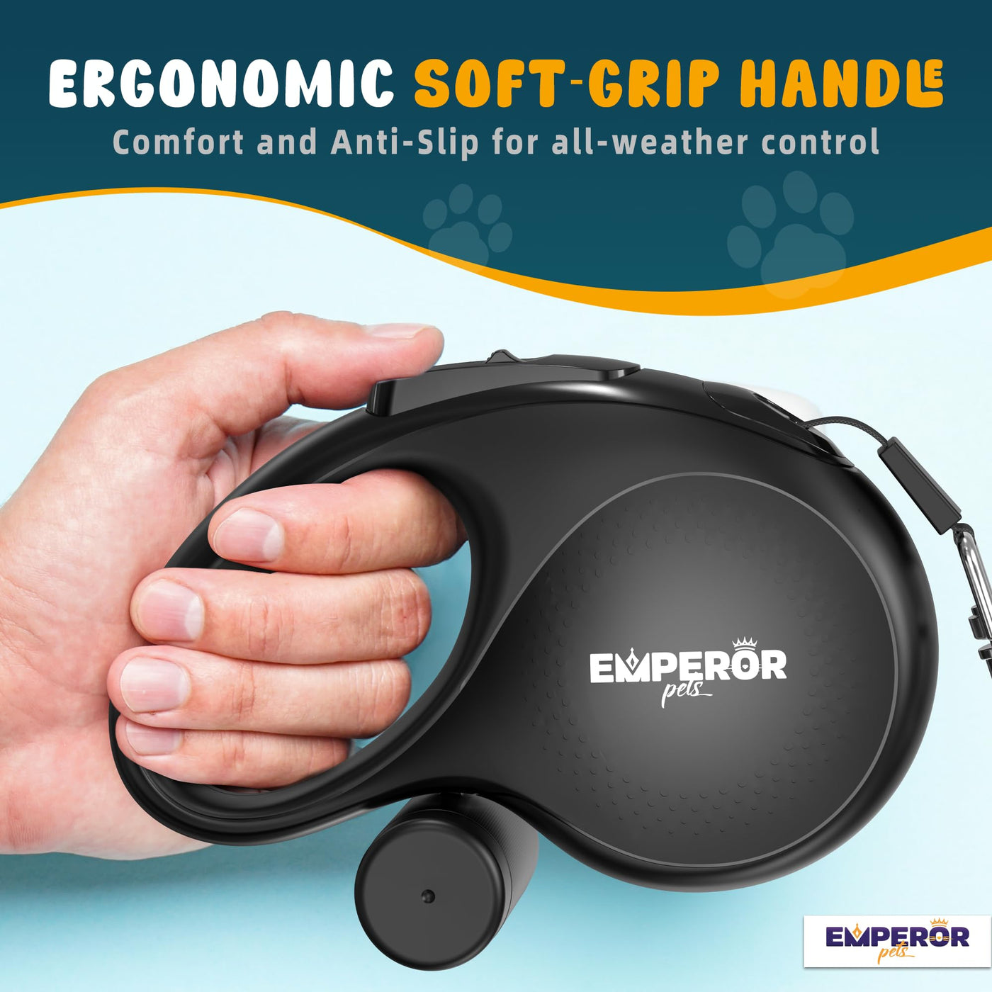 Emperor Pets 26 Ft Retractable Dog Leash Black - Heavy Duty Retractable Pet Leash With Anti-Slip Grip - Reflective Dog Leash Tap