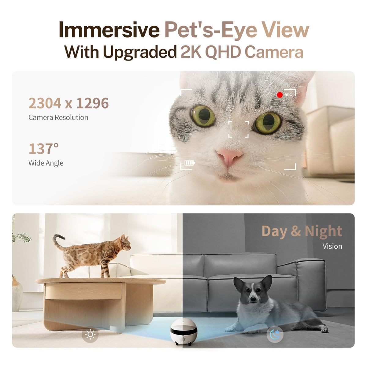ROLA Mini pet camera robot combines cutting-edge technology with playful design, featuring wheels to ensure a smooth movement and stable navigation throughout your home to check any corner. The crystal-clear 2K camera captures every playful moment in stunning detail, while four infrared LEDs ensure excellent visibility even in low-light conditions. With 32GB of storage, you 'll never miss a precious moment. The robot 's endearing big-eyed design isn 't just cute - it 's engineered with a self-righting body that always stays upright, even when your curious pet gives it a friendly nudge. Communication is seamless through the ROLA App, featuring one-touch calling and crystal-clear two-way talk through the built-in mic and speaker, making it feel like you 're right there with your family. Powered by a 5000 mAh battery, ROLA Mini provides extended monitoring time, while the hassle-free magnetic USB-C charging system makes powering up as simple as a snap. From its mobility to its user-friendly features, ROLA Mini transforms the way you connect with your family, serving as your eyes, ears, and loving presence when you 're away from home