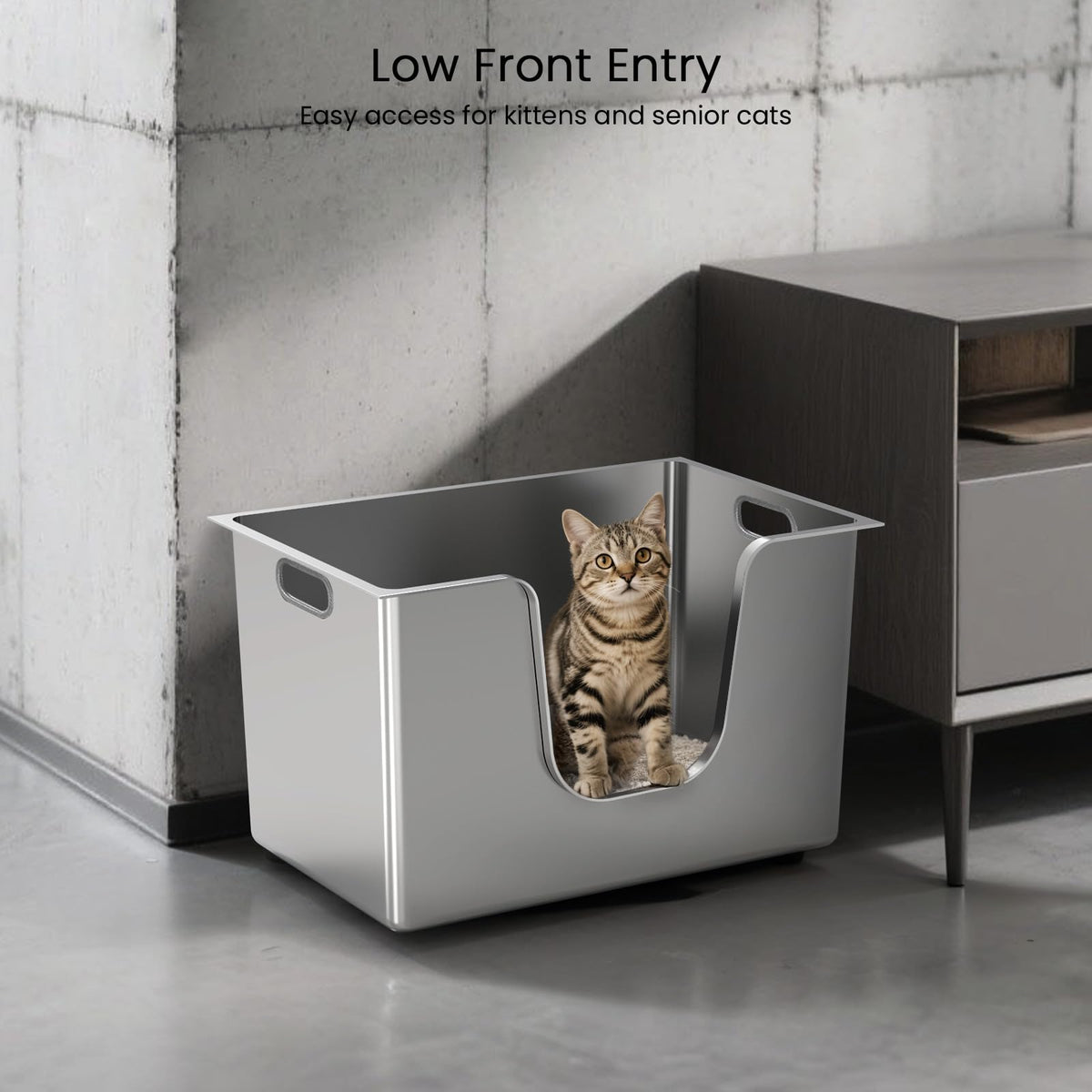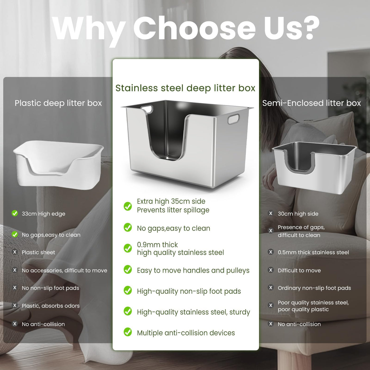 Ptlom Enclosed Xxl Cat Litter Boxes Stainless Steel Pan Provide Your Cat With A Comfortable And Convenient Toileting Experience. One-Piece, Seamless Design - This High-Side Metal Litter Box Features A Sturdy, Seamless Construction That Eliminates Potential Weak Spots Or Gaps, Ensuring A Leak-Proof, Mess-Free Experience. The Sturdy And Durable Stainless Steel Material Is Durable And Easy To Clean, Ensuring Long-Term Use. Product Features Xxl Large Capacity: The Generous Size Offers Ample Space For Cats To Turn, Dig, And Move Freely, While The High-Capacity Design Reduces The Need For Frequent Cleaning, Saving You Time And Effort. Extra-Wide Edge Opening: The Wide Edge Opening Ensures Easy Access For Your Cat, Making It Ideal For Larger Or Older Cats With Mobility Challenges. Anti-Spill Design To Prevent Leaks:Designed With A High, Secure Rim And Sturdy Construction, This Litter Box Minimizes The Risk Of Urine Spillage, Keeping Your Floors Clean And Odor-Free. Built-In Wheels For Easy Mobility: Equipped With Smooth, Built-In Wheels, This Litter Box Is Effortless To Move, Allowing You To Reposition Or Clean It Without The Need For Heavy Lifting. Durable Stainless Steel:Corrosion-Resistant And Easy To Clean, Ensuring Long-Term Durability And Hygiene. High-Rim Design: Prevents Litter Spillage And Reduces The Frequency Of Cleaning, Helping You Maintain A Tidy Environment. Complete Accessories, And Clean Floor:The Non-Slip Cat Litter Mat Is Included To Effectively Collect The Litter Brought By The Cat And Keep The Floor Clean And Tidy. If You Have Any Questions Or Concerns, Please Dont Hesitate To Reach Out. We Are Committed To Providing A Satisfactory Solution Within 24 Hours!