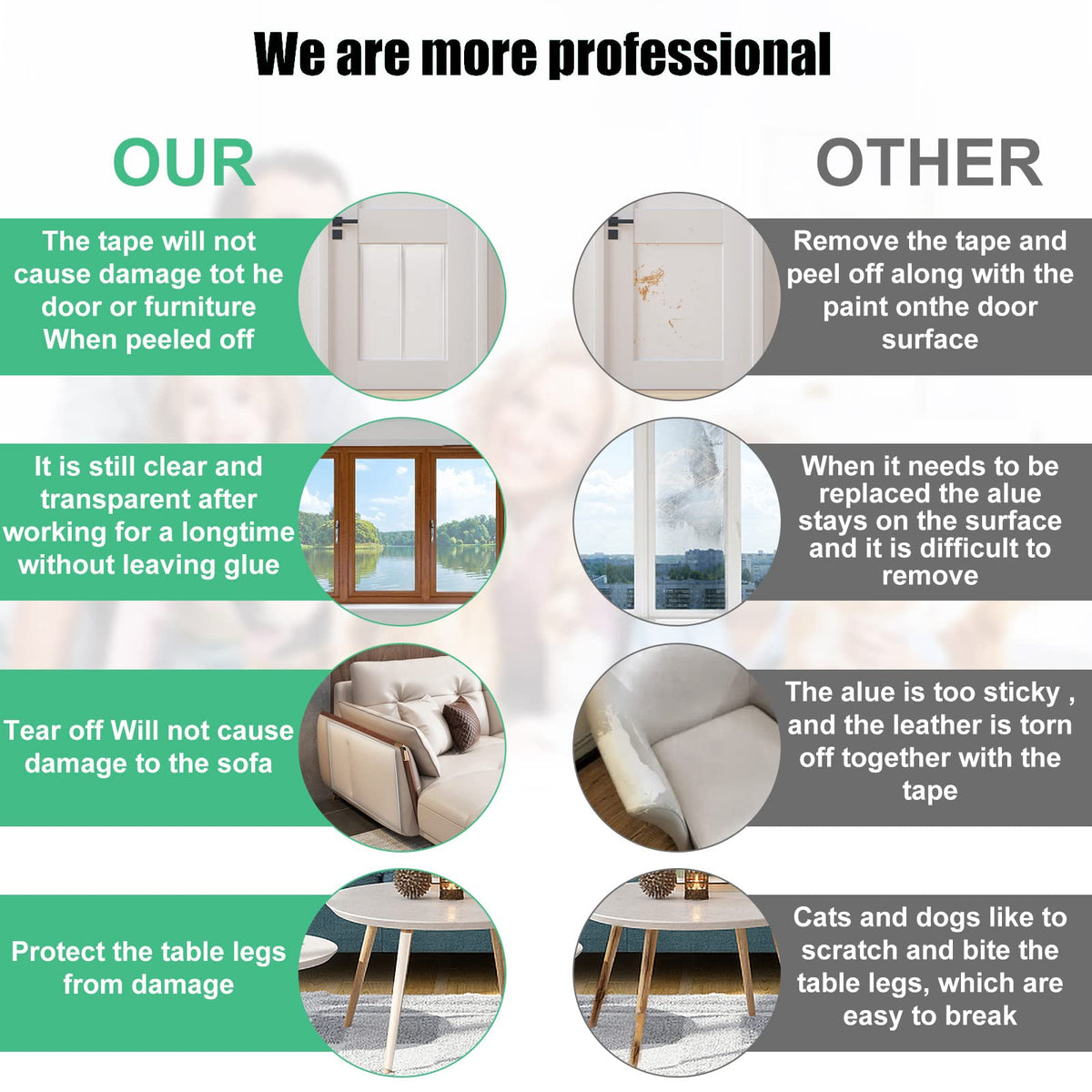furniture, fabric sofas, doors, stairs, carpets, table legs, sofas, chairs, walls, tables, counters, doorways, screened-in porches, etc. It can work anywhere you want to protect.