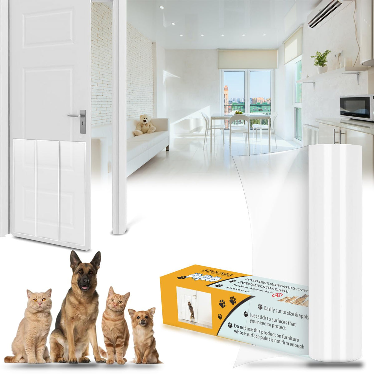 Q: What makes this door protector different from other options?A: The Enhanced Door Protector stands out due to its durability, flexibility, and ease of use. Made from thick industrial-grade vinyl, it withstands aggressive scratching while remaining transparent and unobtrusive. Additionally, it trains pets to stop scratching by eliminating the sensation of claw sharpening.