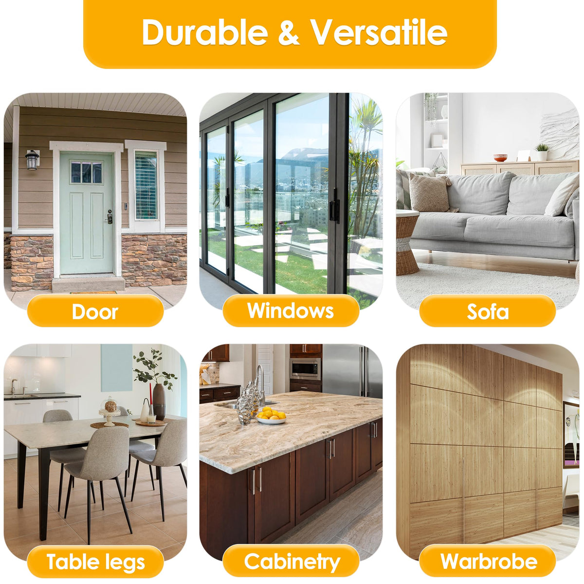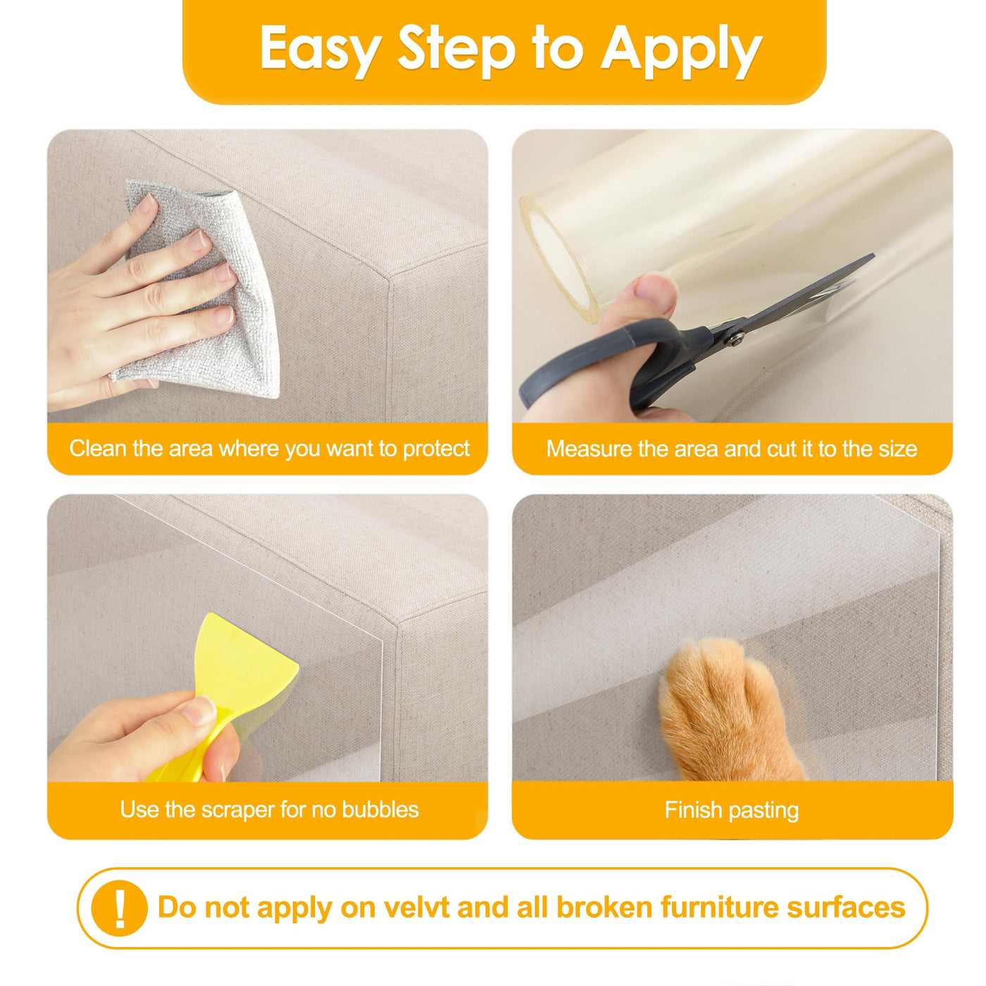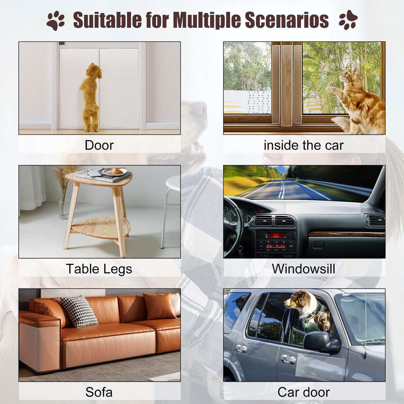 Q: What surfaces can the Enhanced Door Protector be applied to?A: The Enhanced Door Protector can be applied to various surfaces including doors, walls, furniture, fabric sofas, stairs, carpets, table legs, and door frames. Its versatility makes it suitable for protecting any area that may be susceptible to scratches from pets.