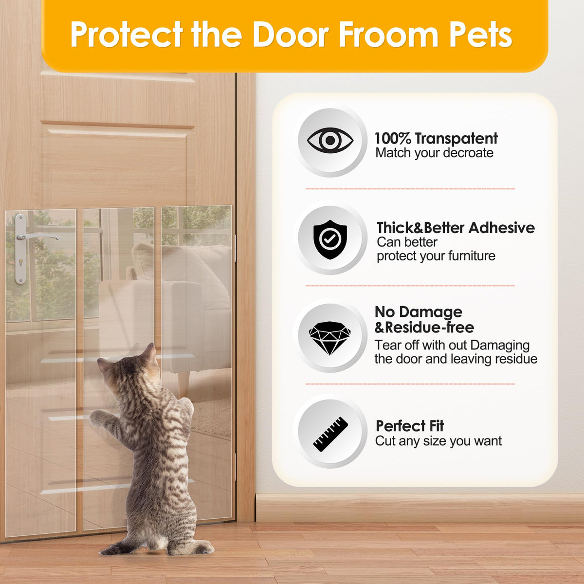 Q: Is the door scratch guard transparent?A: Yes, the Enhanced Door Protector is made from clear industrial-grade vinyl, providing invisible protection. It blends seamlessly with your furniture and surfaces, ensuring that it is unnoticeable while effectively guarding against pet scratches.