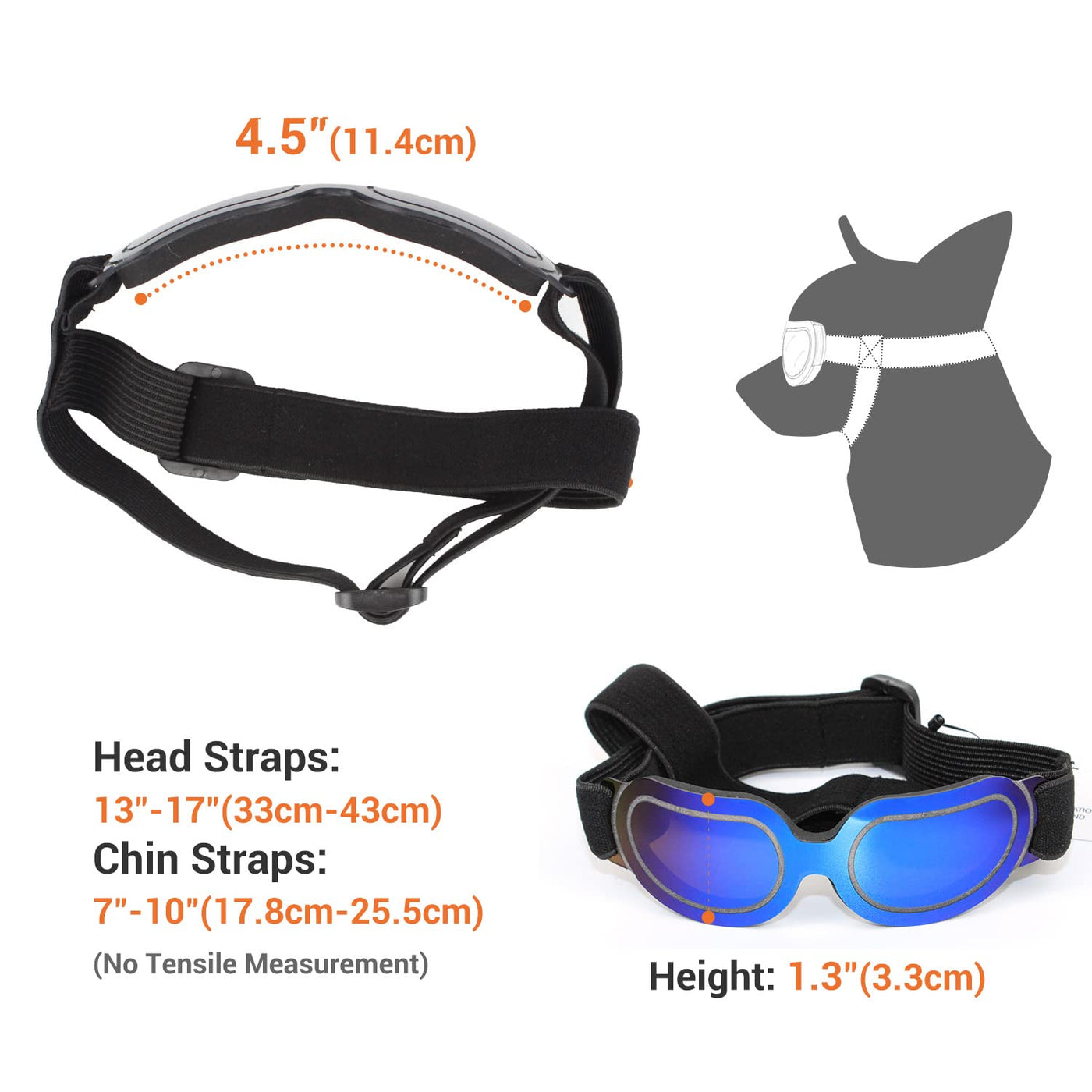Features : 1- Anti UV coating material; 2 - Adjustable head and chin straps ; 3 - Lightweight 0.044lb without any weight pressure Size : Head adjustable 13'-17'; Chin adjustable : 7'-10' ; Lens length : 4.5'; Fit puppies like Yorkie, Pomeranian, Silky terrier, etc. For : Not only best eye protection for your pet, but also it will dress up your pet's look. Tips : 1 - Please measure your pet's head and chin before order. 2 - Please allow 1 inch error by manual measurement, thanks. Package : 1 × Pet sunglasses