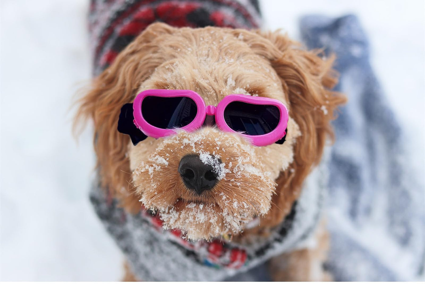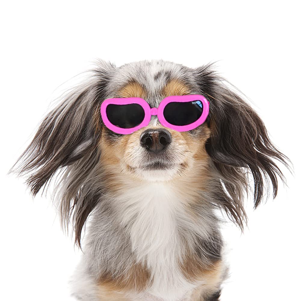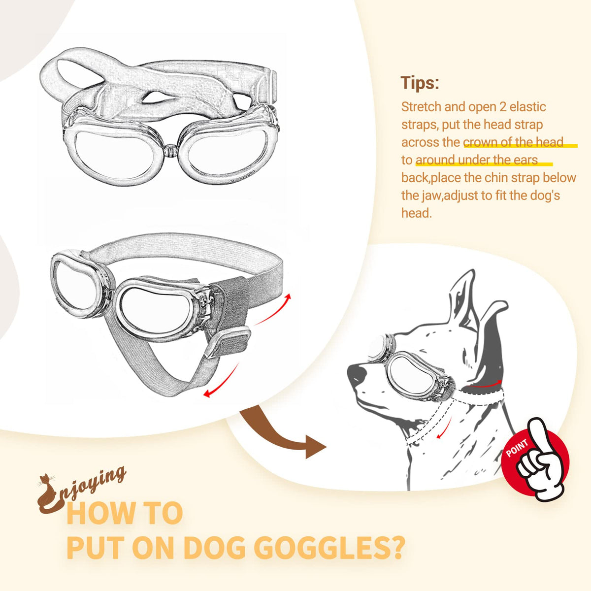 Pink pet sunglasses made by PVC frame and UV400 lenses, lightweight, sturdiness and durable. UV400 rated sunglasses are essential for filtering out sunlight reflected glare and protecting dog eyes against long time UV damage. Foam padding around inside the goggles for a nice snug fit and skin-friendly. The eyecups are deep enough to not irritate or hinder the dog's eyes. Fully enclosed goggles would make pet eyes won’t get wind, dirt, sand damaged or whatever else may fly through the air. Need to adjust two straps to a suitable length, stretch two straps and through dog mouth, take the head strap over the top of head to around under the ears, then adjust the goggles to fit dog face. If not, they easily move all over your doggy snout to touch/interfere puppy eyes.