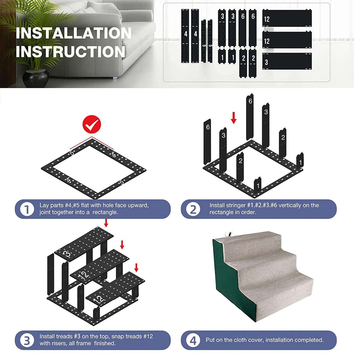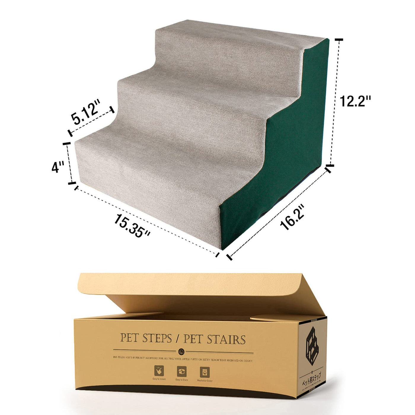 3-step dog stairs assembled suitable for older cats and small to medium dogs suffering from arthritis or other limited mobility Total size is 1535 length x 162 width x 122 height Perfect color combination of gray&green doggie steps become a fashionable furniture in the home Ladder cover is removable and machine-washable Dont worry about getting dirty and unable to replace during use Help your little animals to reach the high bed couch or sofa perfectly cat stairs can easily match the height of your furniture Need to assemble and install this small dog ramps by yourself During the installation the zipper should be at the bottom of the No 4 and 5 parts please read the attached installation instructions carefully to do it