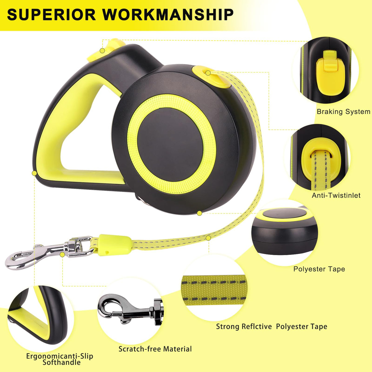 1.Enrgticdg Has Long Focused On The High Quality Of Products And Customer Experience Over Time . 2.The Retractable Dog Leash Adapts Corrosion Resistant Plastic And 16 Ft Strong Nylon Tape And Scrupulous Details Disposal, And Ergonomic Handle Grip Design Fit Hands Better.3.A Reliablequick Lock And Unlock Featureis Flexible To Adjust The Length Of The Leash To Stay An Appropriate Length.4.With The Powerful Upgrade Spring And Anti-Winding Rope, The Dog Leash Can Be Smoothly Retracted And Released At Any Angle, Giving Your Pet Plenty Of Room To Enjoy Free.5.Do Not Fully Release The Leash When The Dog Rush Forward, The Strong Impact Will Damage The Spring And Internal Accessories.It Needs To Be Locked In Time.
