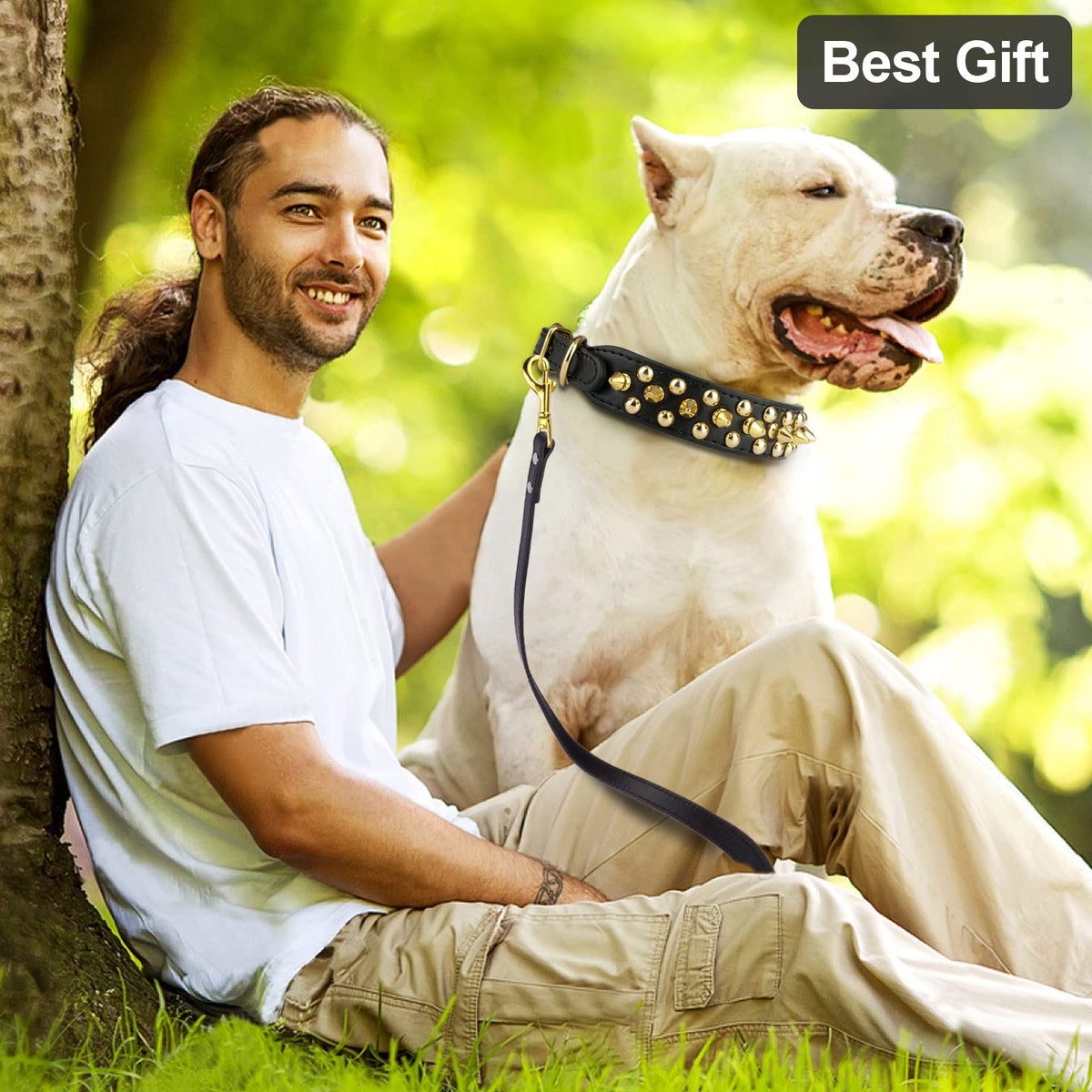 FASHION GOLDEN SPIKED STUDDED LEATHER DOG COLLAR WITH LEASH: These cool spikes are not overly sharp so it doesn't hurt your pet's skin and the studs don't pull dogs' hair out. After wearing the studded collar Your animals could not destroy the collar or be bitted around the neck because of the spikes. Gives them added protection during cat/dog war play time!