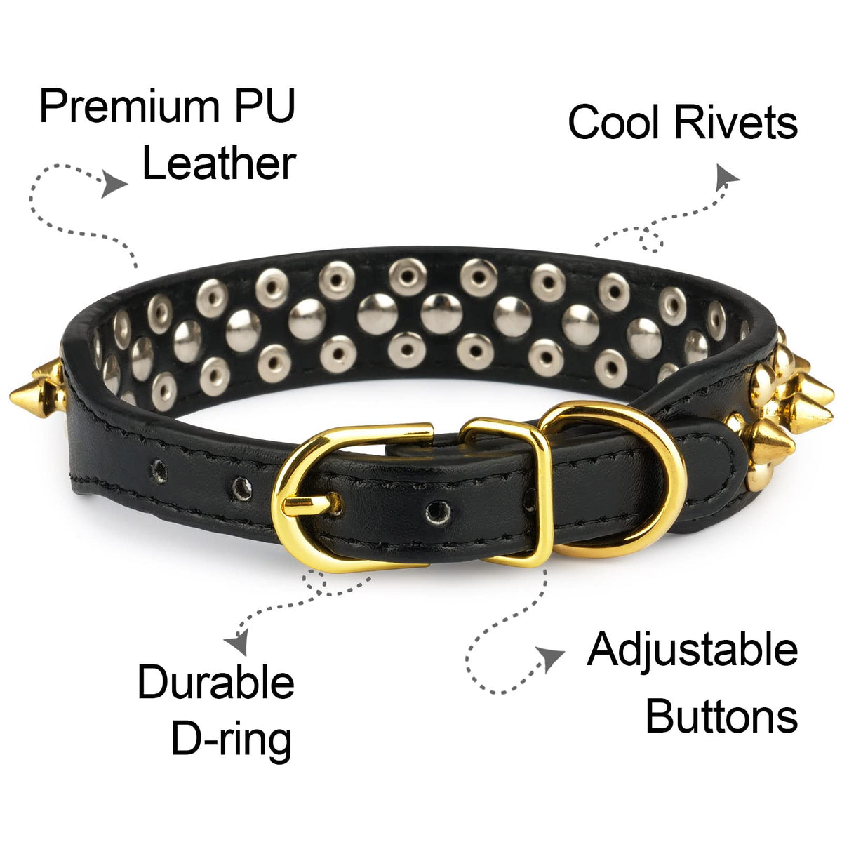 Q: Is the Golden Spike Collar suitable for cats as well as dogs?A: Yes, the Golden Spike Collar is designed to be adjustable and can be worn by both small dogs and cats, making it a versatile accessory for your pets.