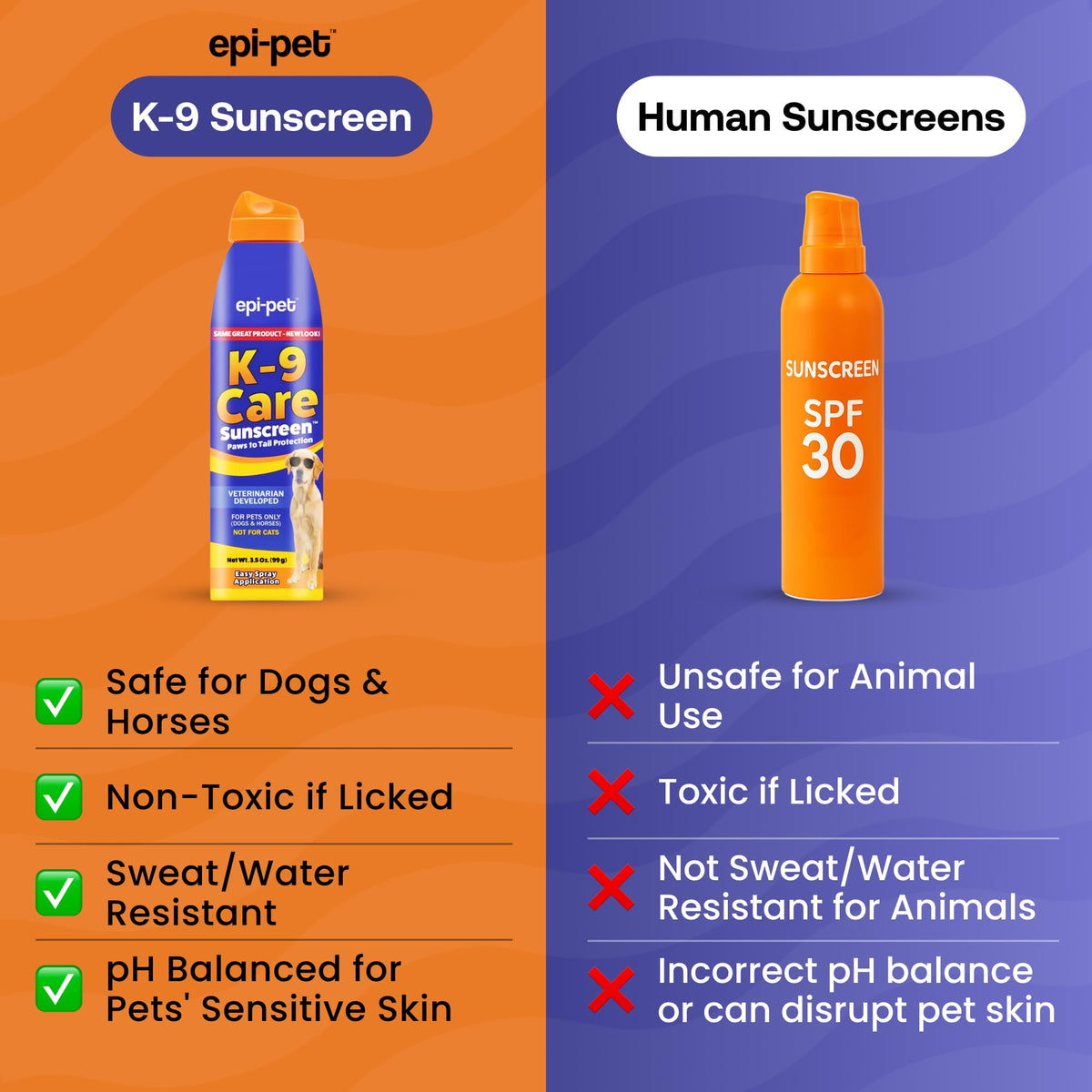 Q: What pets can use Epi-Pet K-9 Care Sunscreen?A: Epi-Pet K-9 Care Sunscreen is specially formulated for dogs and horses. It is not safe for use on cats. This sunscreen is ideal for pets with short or thin hair, light-colored fur, or those exposed to excessive sun.
