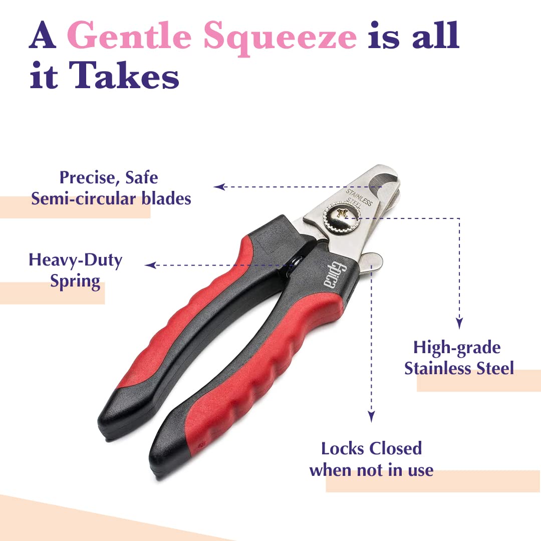 Make trimming your dog's nails easier and safer with the superior performance of the Epica Pet Nail Clipper. Both you and your pet will appreciate the difference! Top Quality Stainless Steel Construction Made with high grade stainless steel, these durable clippers won't bend, scratch or rust, and the blades will stay sharp through many sessions on tough dog nails. Precise Cutting for Health and Comfort Sharp blades let you work faster, with less effort, and cut the nail cleanly without ragged edges that have to be filed. If your dog is skittish about the process, this will make both of your lives happier. Plus, you'll be more likely to keep his nails trimmed, allowing him to walk comfortably and helping prevent damage to your floors and furniture. Sized for Small and Medium Dog Breeds Correct spacing of the blades is important for effective and safe use. These clippers are designed specifically for small and medium size dogs such as terriers, spaniels, dachshunds, poodles, bulldogs, collies and Labrador retrievers. Safety Lock When they're not in use, the Epica clippers can be locked with the blades in the closed position. This safety feature ensures that you won't accidentally cut yourself when taking them out of the drawer, and that the blades won't damage or be damaged by other items they're stored with. Secure Grip Rubber Coated Handles Excessive hand strength is not necessary to operate the Epica clippers. The handles are shaped to fit your fingers and coated with anti-slip rubber so there's no need to hold them in a tiring, super-tight grip. Simply grasp them normally as you apply pressure, with no worries about slipping, sliding or accidentally hurting your pet.