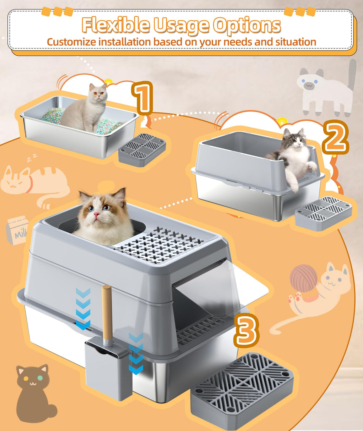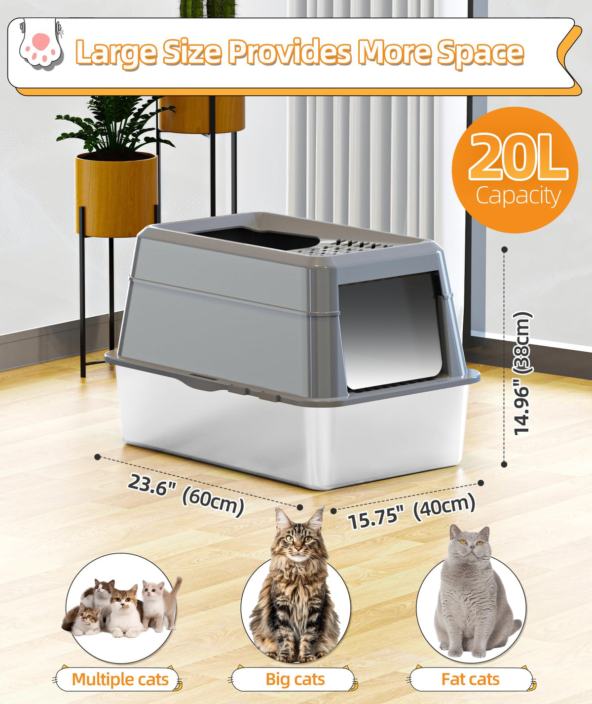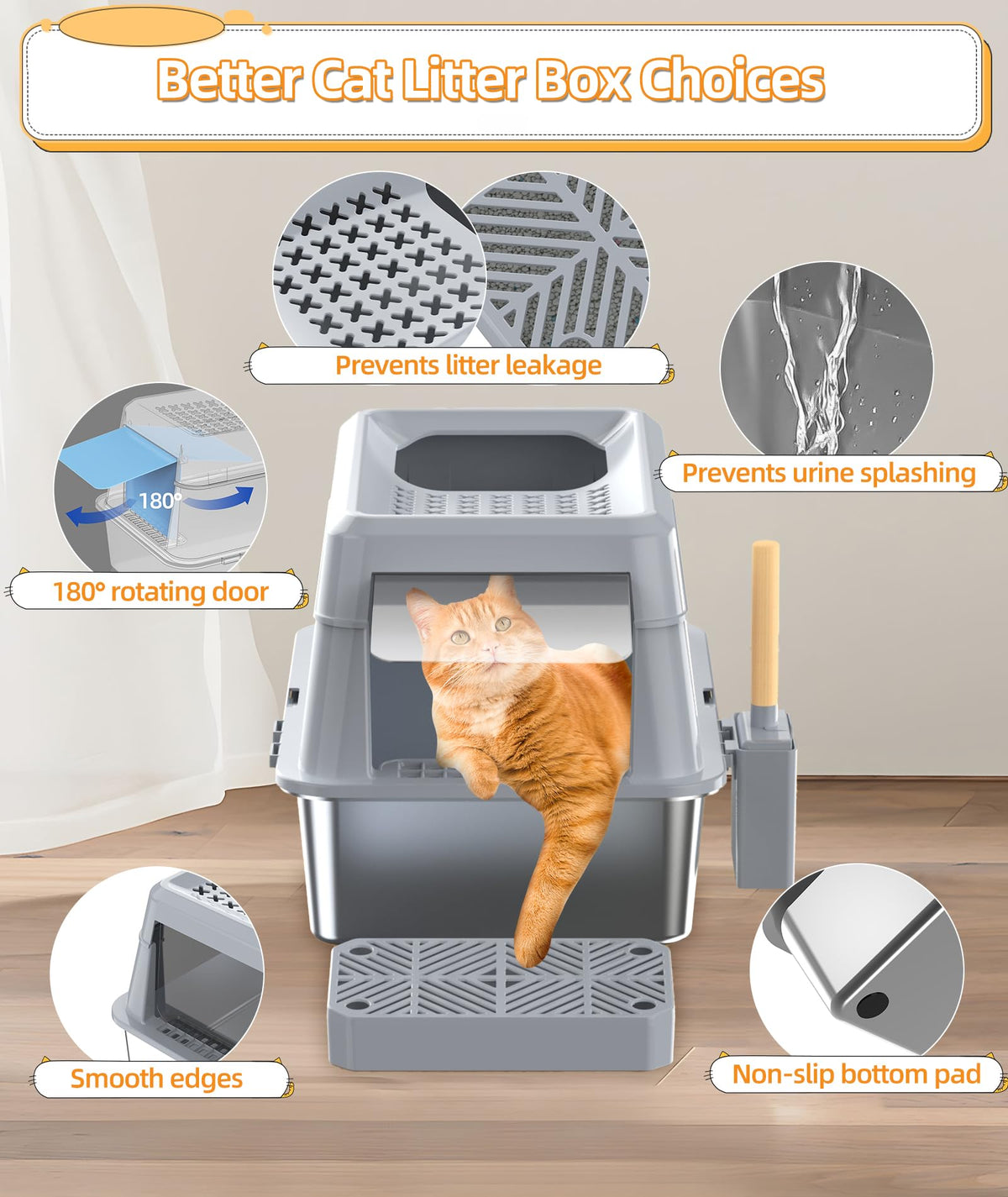 Epn Stainless Steel Cat Litter Box With Lip, Xxl Extra Large Enclosed Removable Metal Litter Box For Big Cats, High Sided Enclosure, Scoop & Footboard, Leak-Proof, Odorless, Easy To Clean(Light Grey