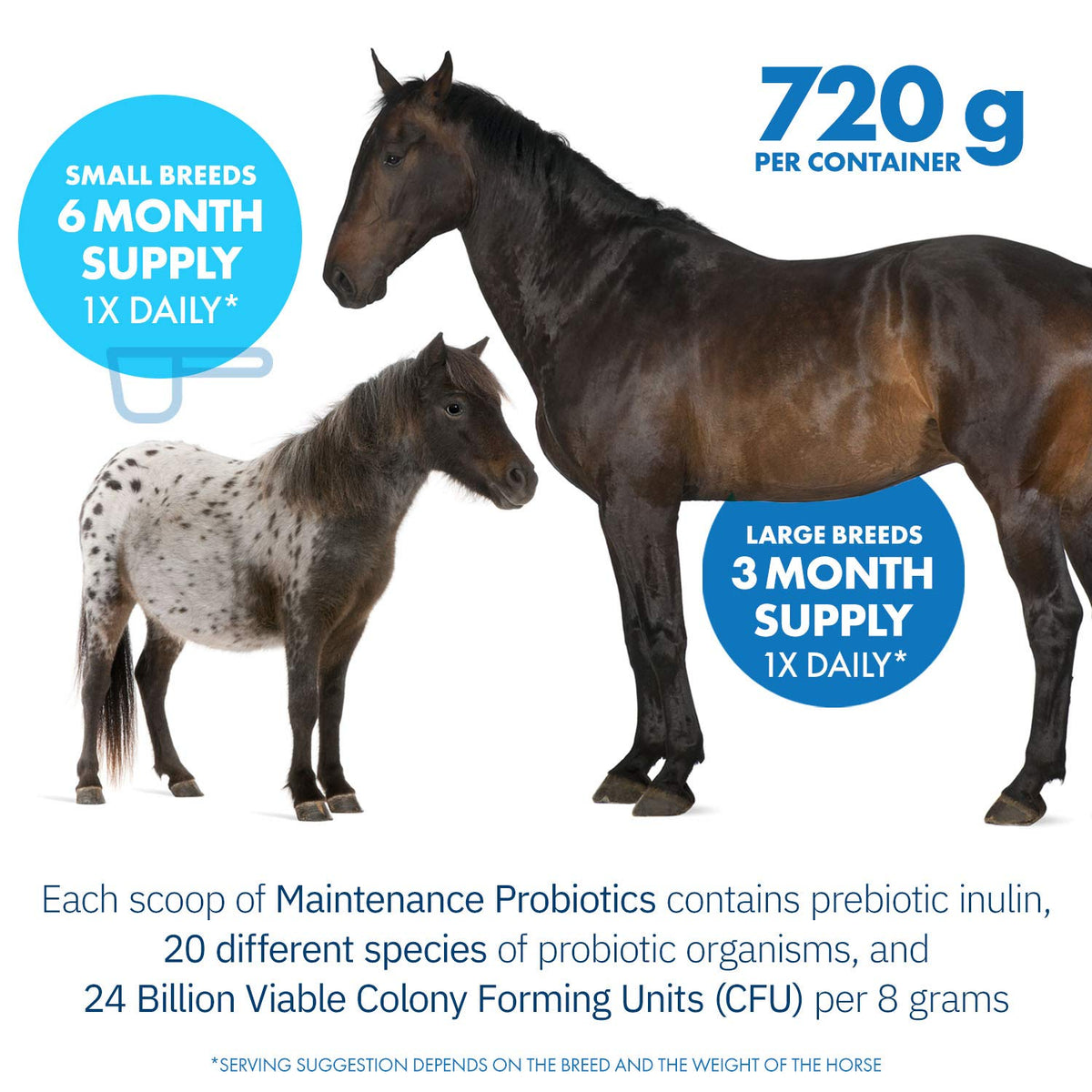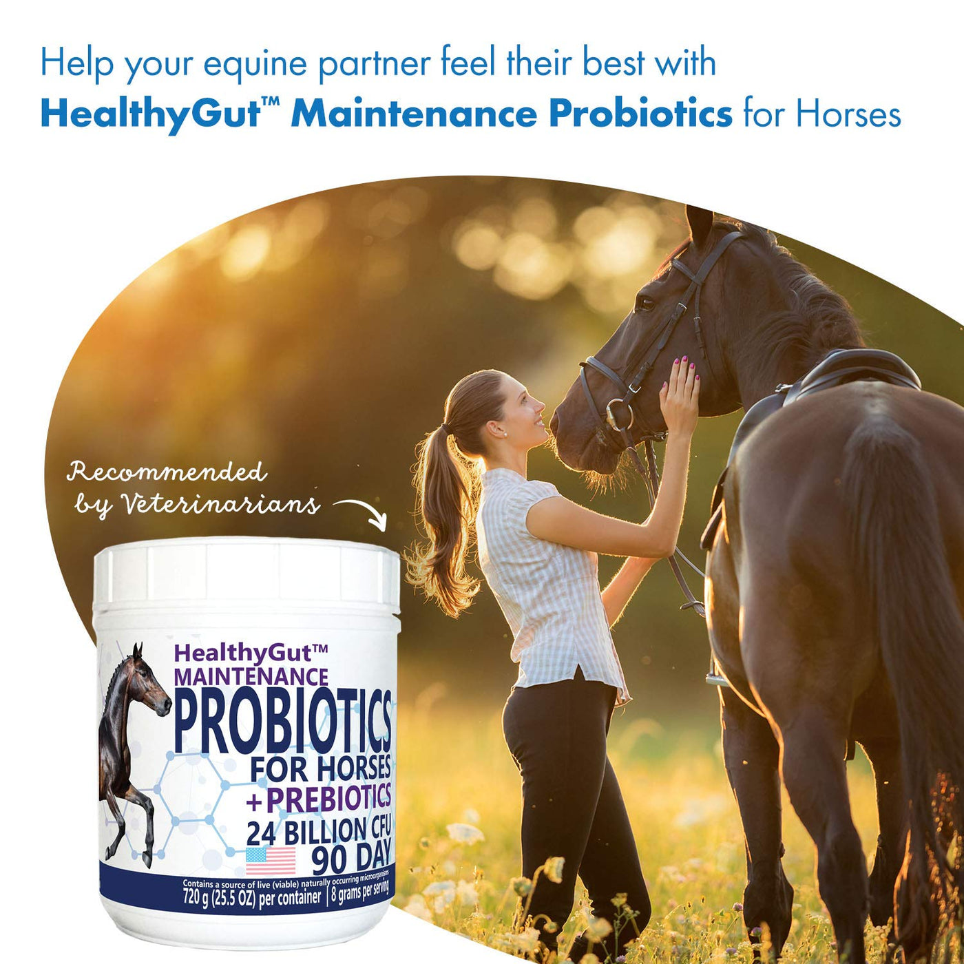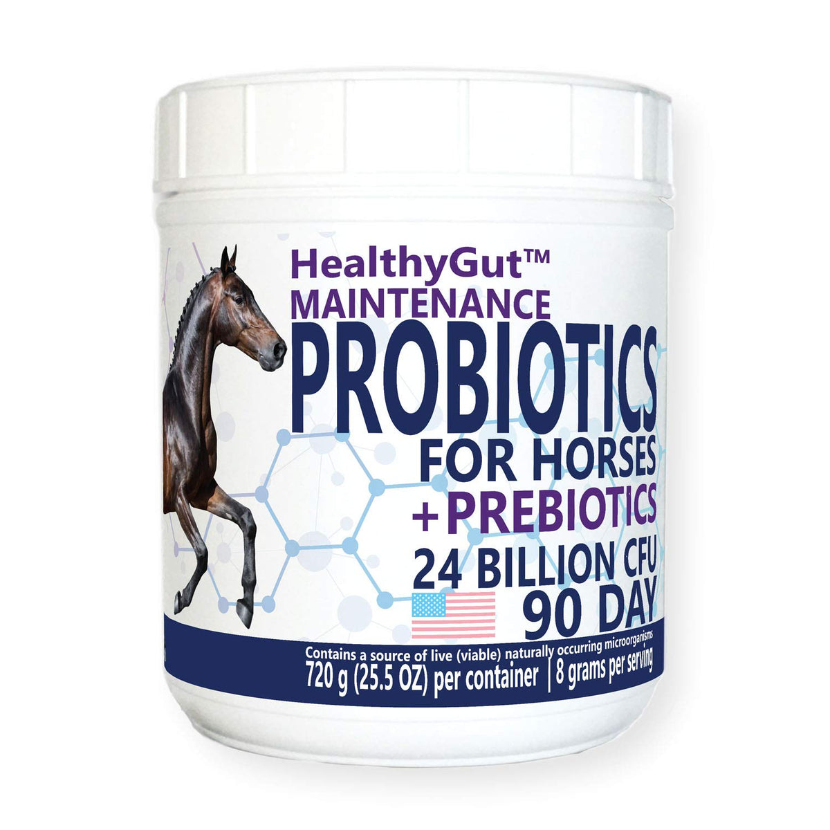 Support Your Horses Digestive System with ProbioticsDoes your horse suffer from diarrhea or require digestive support? Finally, a quality and purity tested dietary supplement for horses that is formulated with human-grade ingredients and manufactured to human-grade standards. Animal grade is just not in our vocabulary!HealthyGut Probiotics for Horses Maintenance Formula holistically promotes normal digestion, helps defend against ulcers and effects from stress, aids relief from digestive upset or antibiotic use, and aids general hind gut support in your horse. It contains 20 species of freeze dried probiotic organisms and prebiotic inulin. It is non-GMO and made in the USA.Simply sprinkle tablespoons of tasty powder on your horses food every day to provide them with much-needed support. Sprinkle according to their weight:Under 500 lbs: 1/2 tablespoon500-1500 lbs: 1 tablespoonOver 1500 lbs: 2 tablespoons