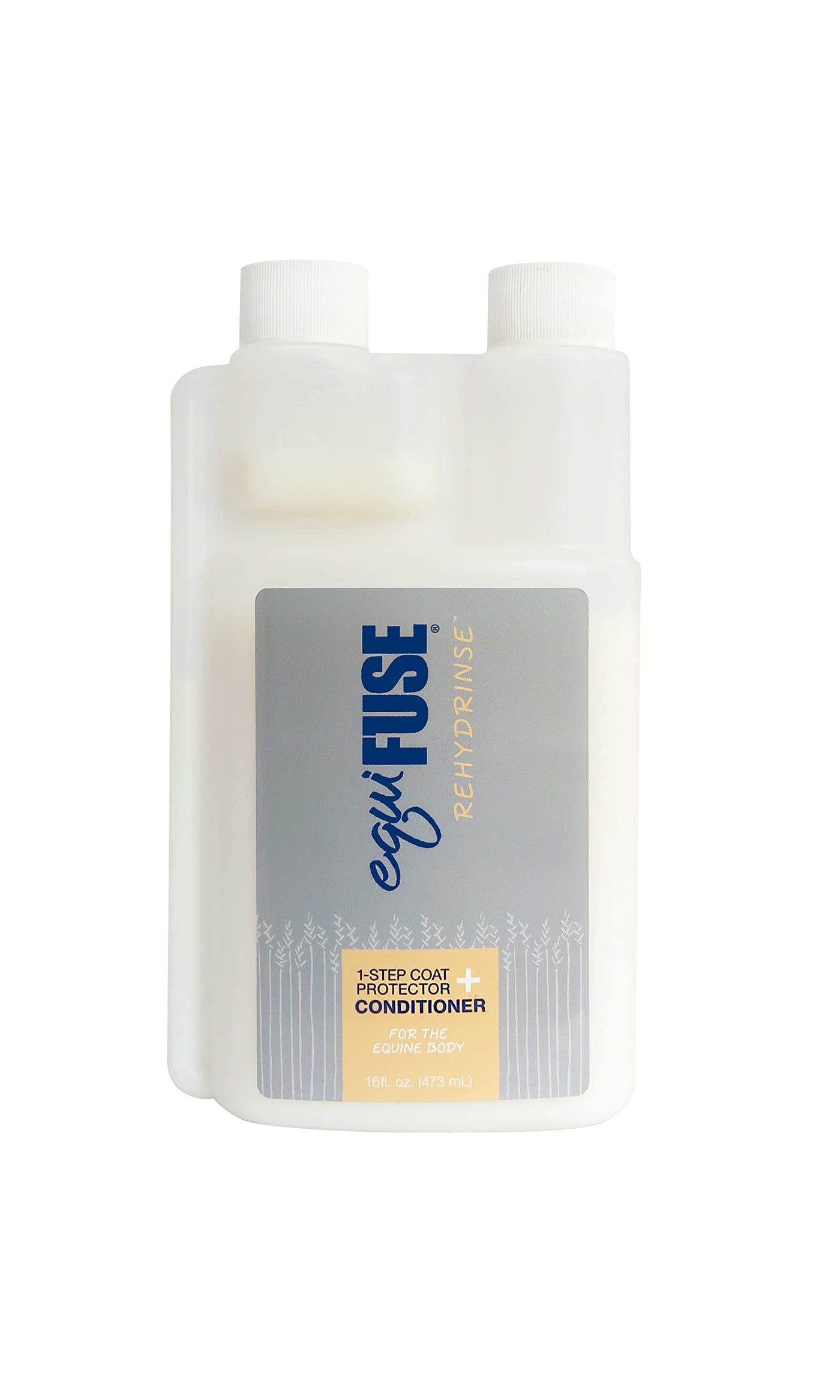 Q: What makes EquiFUSE Rehydrinse different from other coat conditioners?A: EquiFUSE Rehydrinse stands out due to its unique formulation of hydrolyzed wheat protein and almond oil, which not only condition but also protect against dehydration. Its non-greasy formula ensures a lightweight finish without making the coat slick.