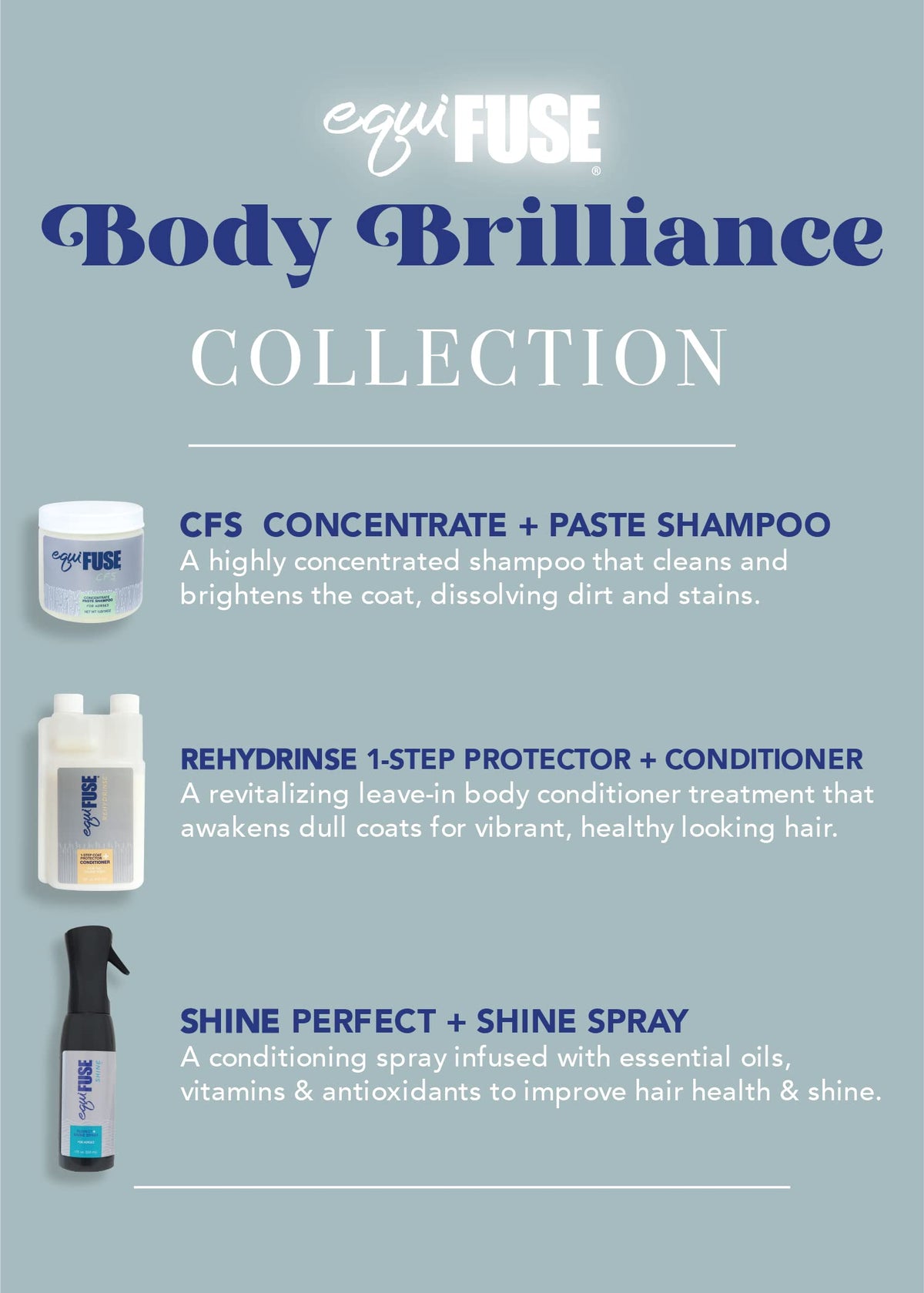 Q: How does EquiFUSE Rehydrinse improve my horse's coat?A: EquiFUSE Rehydrinse contains hydrolyzed wheat protein that fortifies and strengthens the coat, while almond oil provides deep conditioning. This unique blend enhances the coat's softness and resilience, making it look vibrant and healthy.