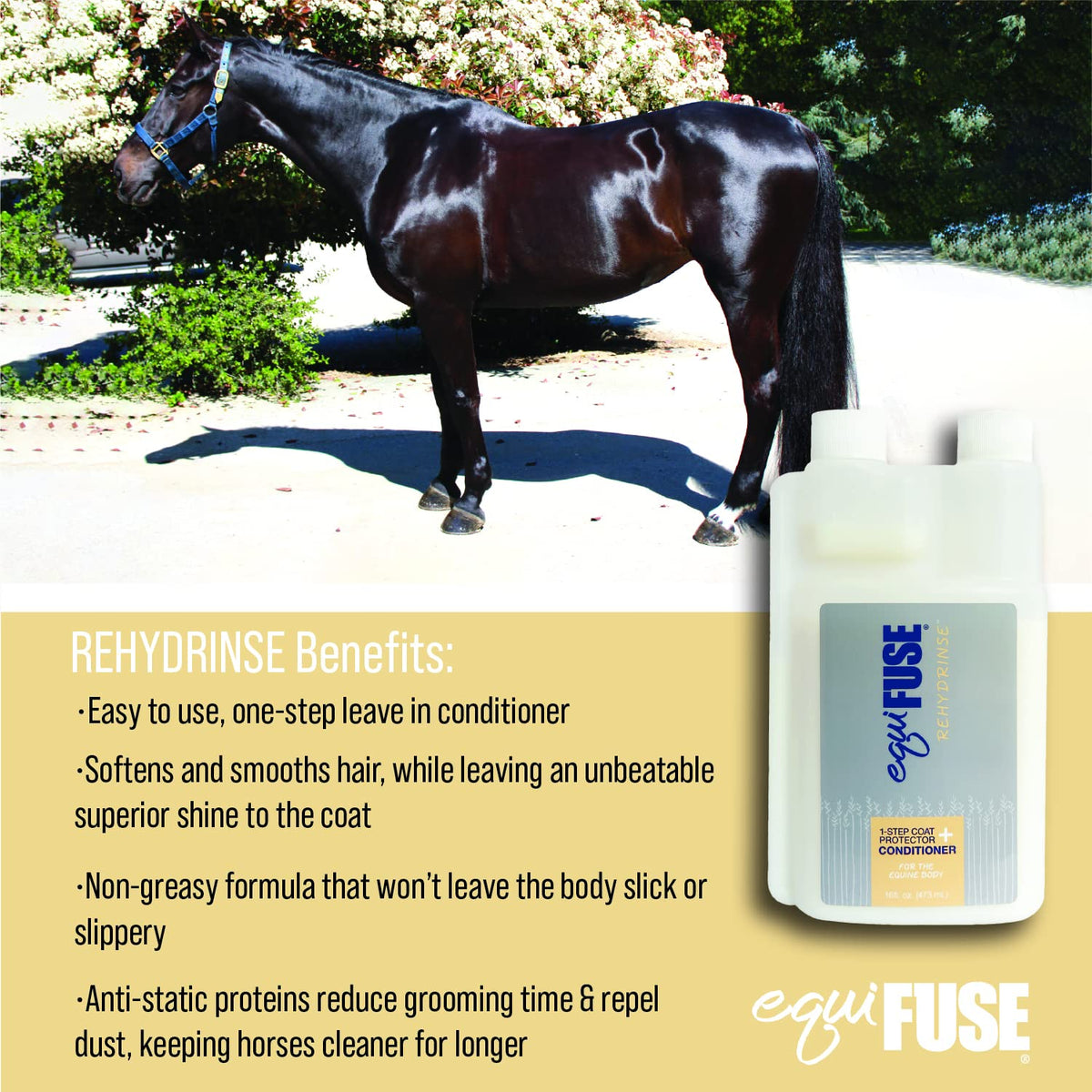 - Leave On Horse Coat Conditioner That Is Applied With Only 1 Step - Hydrolyzed Wheat Protein And Almond Oil Protect, Moisturize And Promote A Healthy Coat - Non-Greasy Formula That Won'T Leave The Body Slick Or Slippery - Softens And Smoothes The Horse'S Hair And Skin - Anti-Static Properties Help Repel Dust And Dirt - Significantly Reduces Grooming Time For 5 - 7 Days Rehydrinse 1 Step Coat Protector + Conditioner Is The Ultimate Necessity For The Serious Horse Owner. Rediscover The Soft Resilience Of The Equine Coat With This Nurturing Blend Of Moisturizers And Rich Proteins. Enriched With Hydrolyzed Wheat Protein, This Unique Hydrating Complex Fortifies And Strengthens The Horse'S Coat, While Leaving The Body Satiny Smooth. Almond Oil Completes The Conditioning Experience To Guarantee A Non-Greasy Finish And A Superior Equifuse Shine.
