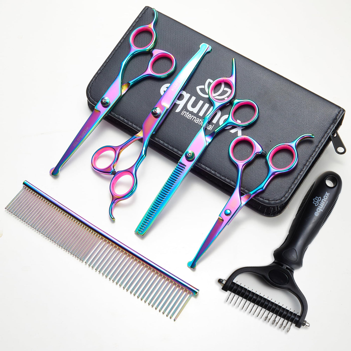 Equinox Dog Grooming Scissors & Deshedder - 7 In 1 Pet Grooming Scissors Set With Undercoat Brush - Curved Dog Scissors With Saf