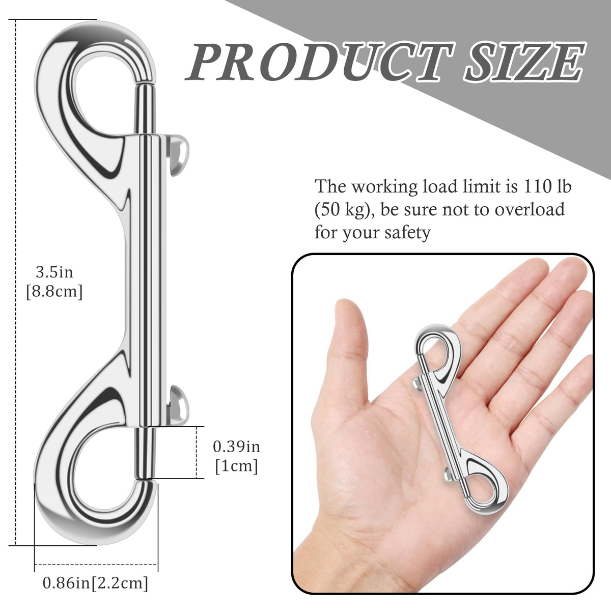 Material: High quality zinc alloy Size: 3-1/2-inch (88mm) Color: Silver Set: 15 pieces Features: 1. Double headed spring hook, compared to single headed heavy-duty snap clips, it is more flexible to be used in various places of life 2. Strong load-bearing capacity, up to 110Bl, within this range you can use it with peace of mind 3. Value package, you will get 15 identical snap clips that can be used simultaneously for dog leash clips, suspension clips, horse trailer accessories, dog cage accessories, trigger hooks, fence clips, and more