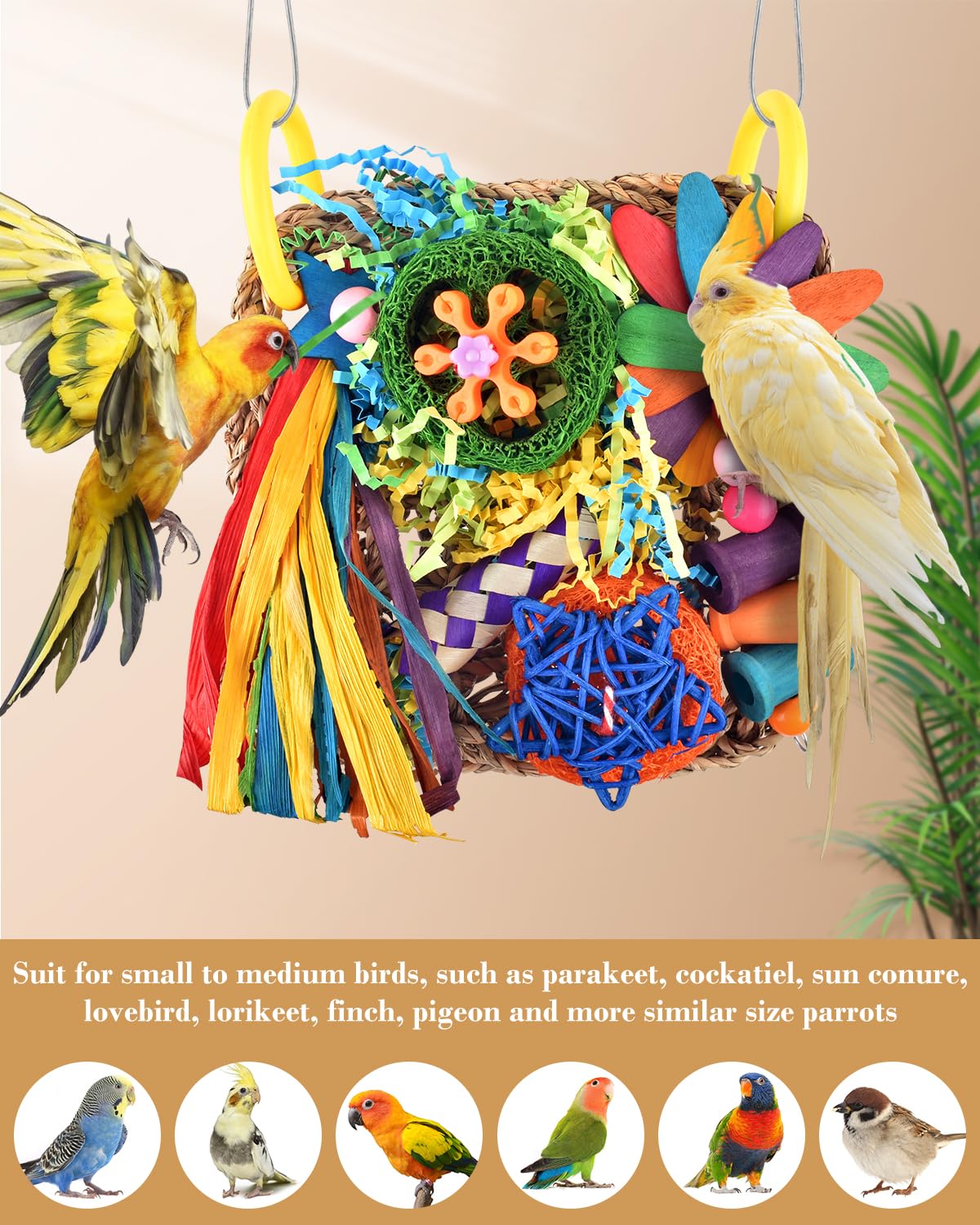 Erkoon Bird Cockatiel Toys Foraging Toys Hanging Parrot Toys For Lovebrid Parakeets Conures Bird Foraging Wall With Colorful Toys For Birds Shredding Seagrass, Birds Cage Toy Accessoriesfeatures:1. Woven From Pure Natural Wood And Cotton Rope.&Nbsp; &Nbsp; Non-Toxic And Safe.2. Colorful Design, Our Bird Seagrass Foraging Wall Will Give Your Bird Friends A Happy Playtime.3. Equipped With A Connector To Fix The Birdcage, Easy To Install.4. Suitable For All Kinds Of Small Parrots, Such As Starlings,Parakeets,Budgerigars, Lovebirds, Finches, Etc