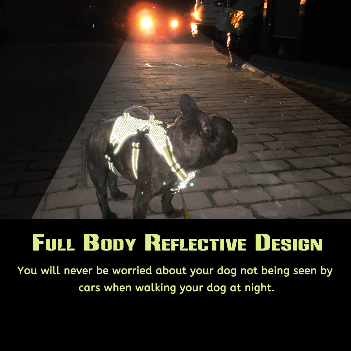 Q: How does the reflective feature enhance safety during walks?A: The full-body reflective design of the harness increases visibility, ensuring your dog can be seen by drivers during nighttime walks, thereby enhancing safety for both you and your pet.