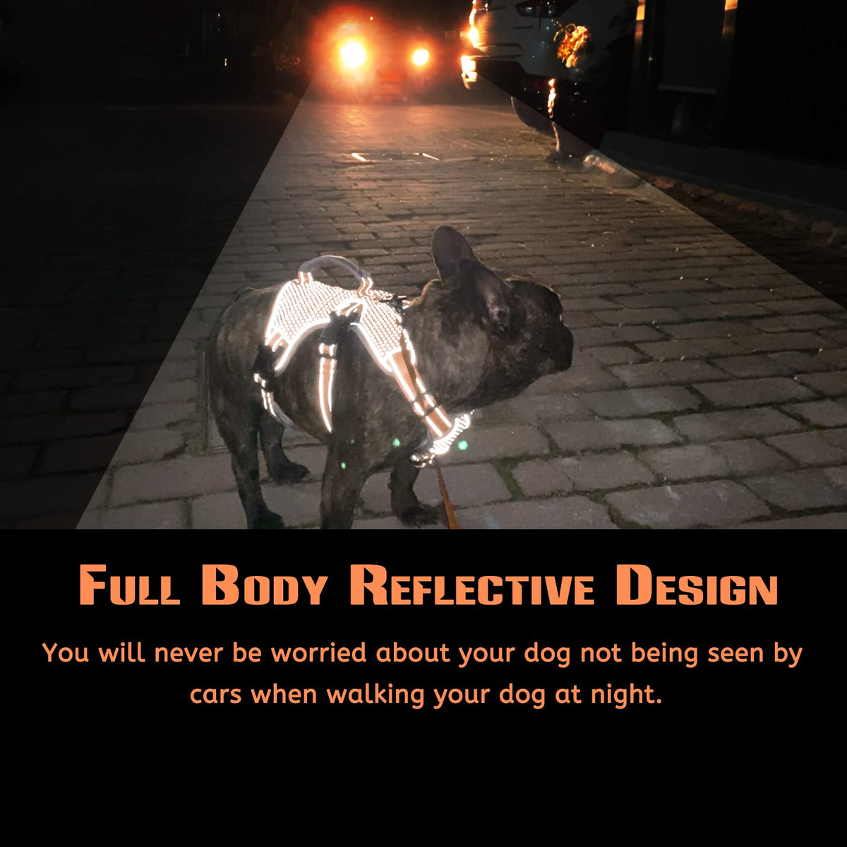 Q: Is the harness safe for night walks?A: Yes, the harness features a full-body reflective design, ensuring your dog is visible during night walks. This enhances safety by making your dog more noticeable to passing vehicles.