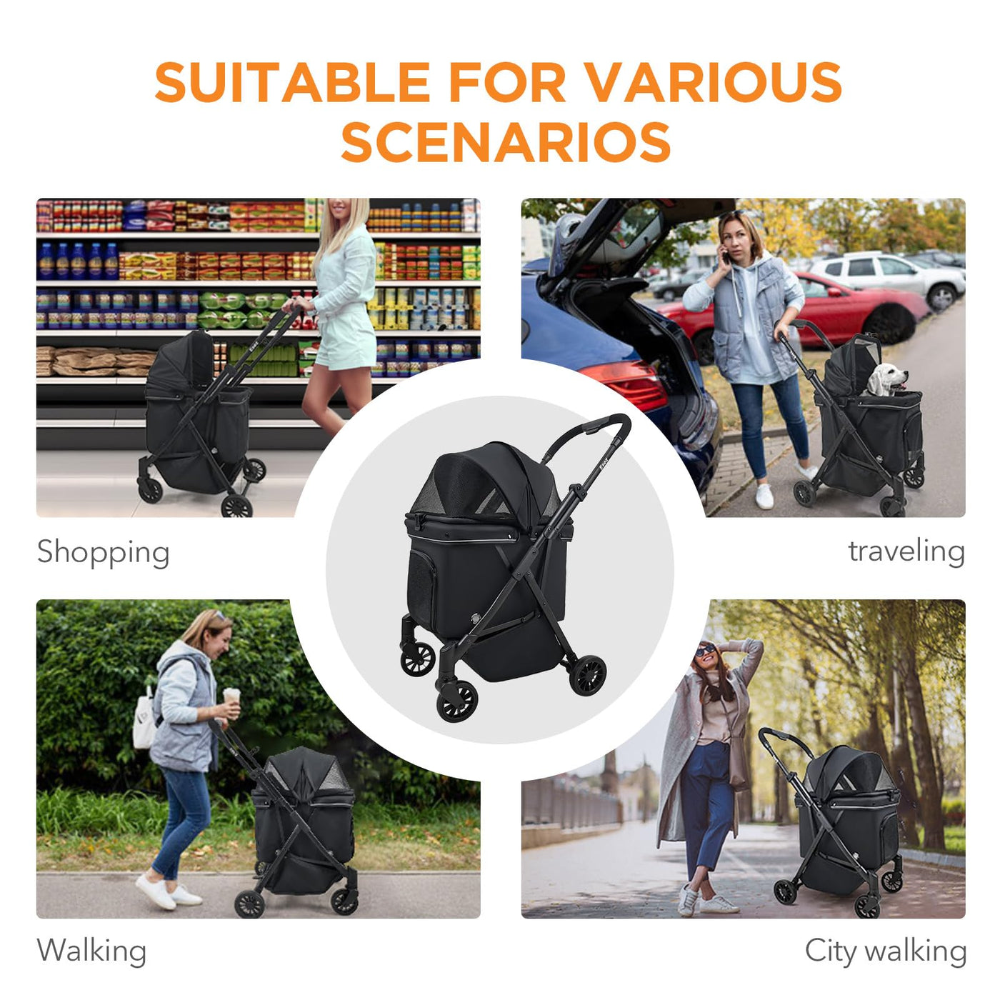 Esez Dog Stroller For Small Dog,Pet Stroller For Small Dogs Up To 20 Lbs,Foldable Compact Cats Puppy Stroller With Storage Basket & Removable Liner,Ideal Dog Pram For Travel And Camping Oxford Cloth + Stainless Steel + Deepened Seat + Double Opening Mode Convenient Design: Esez Pet Stroller Features A Front And Back Buckle Plus A Middle Zipper Design, Making It Easier Than Ever To Open The Canopy For Seamless Interaction With Your Furry Friend. Take Your Dog Or Cat Out Effortlessly, Anytime, Anywhere, And Enjoy The Companionship With Ease. Durable & Comfortable: Crafted From Tough Oxford Fabric, Esez Dog Stroller Can Withstand Up To 20 Lbs And Boasts A Deep Cabin Of 13', Accommodating Various Pet Sizes. With Its Washable Soft Water-Resistant Pad, Your Furry Friend Will Enjoy Extra Comfort On The Go. Ideal For Travel: No Tools Needed For Assembly, And The Pet Stroller Quickly Folds Into A Compact Size, Standing Alone For Easy Storage. Its Foldable Design Makes Esez Dog Stroller The Perfect Choice For Travel And Camping Adventures. Premium Experience: Equipped With A Reversible Cabin, Breathable Canopy, And Zippered Mesh Windows, Esez Pet Stroller Ensures Unobstructed Airflow, Offering Your Pet A Wide View And Satisfying Their Curiosity About The Outside World. Let Your Puppy Bask In The Sunlight And Enjoy The Scenery, Enhancing Their Riding Experience. Peace Of Mind Features: Featuring An Enlarged Privacy Storage Basket, Back Pocket, 2 Built-In Safety Belts, And 360Front Wheels, Rear Wheels With Intuitive Brakes, Esez Dog Stroller Provides An Unparalleled Outing Experience.