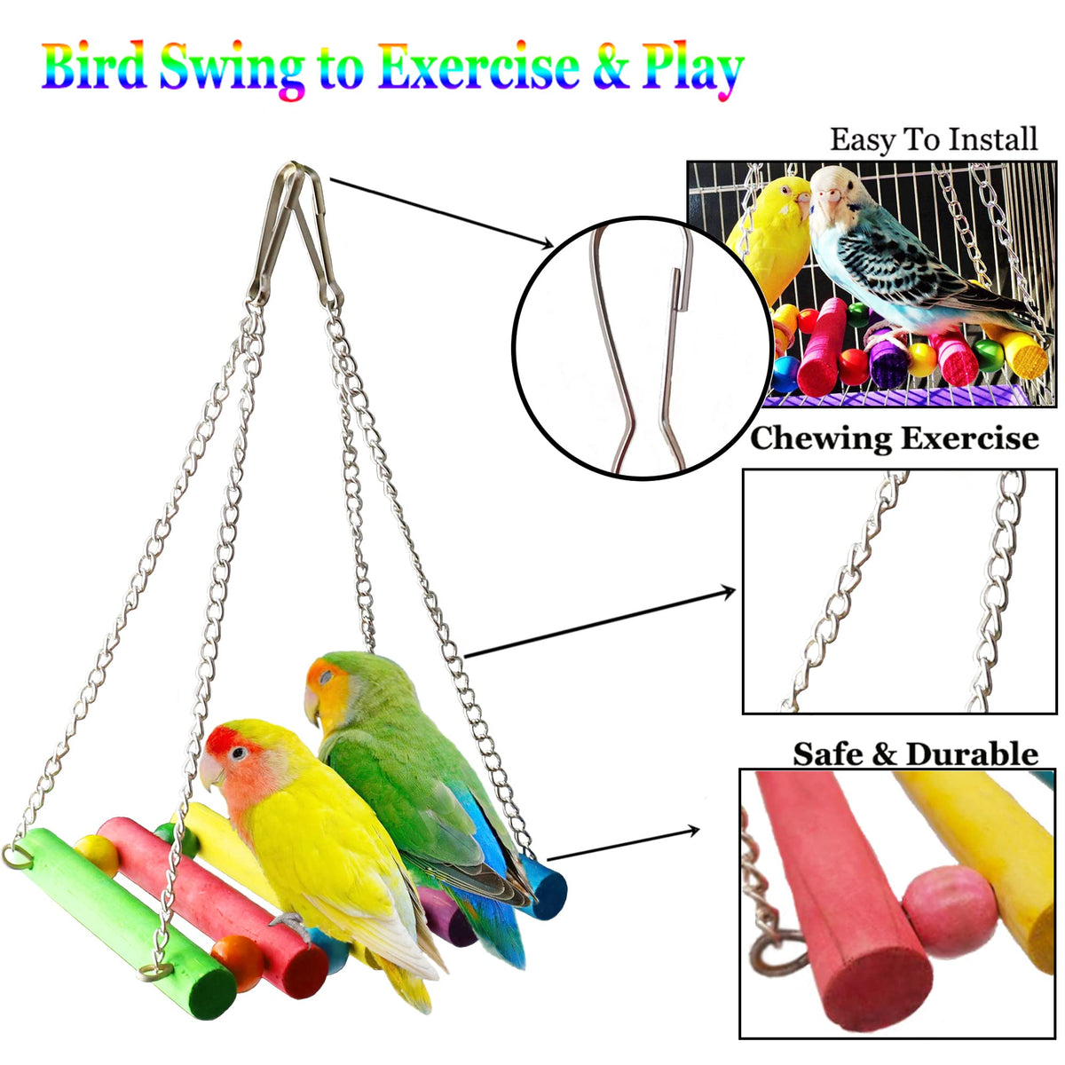 Why Choose ESRISE Parrot Pet Bird Wooden Swing Cage Toy? Bright Color Toys Pet birds like bright color, the swing cage toy are colorful and beautiful, the bell and chewing toy will attract your birds to play and chew. Safety & Bite Resistant The pet bird swing toy is made with durable, food grade materials, making it both bite resistant and pet safe. Wide Use Suitable for parakeets, conures, parrots, cockatiel, parakeet, finches, as well as many small birds. Specifications: Color: Multi-Color Weight: 320g Material: Wooden & Metal Package Include: 2 x Chewing Toys 3 x Hanging Bells Toys 2 x Bird Swing Toys 1 x Mirror Toys