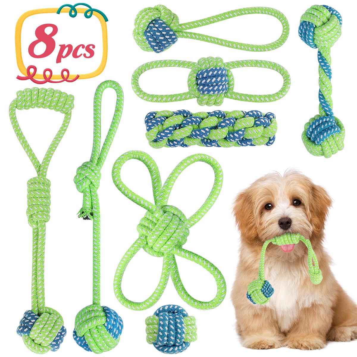 ?Indestructible Puppy Chew Toys: 8-pack pet toys set for puppies and small dogs. It includes 8 different sizes of rope dog toys dog rope toys for aggressive chewers round rope ball dog toys multi knots cotton rope dog chew toys and tug-of-war rope balls. The rope toys are designed with handle loops for you to play with your dog. Suitable for puppy teething tug of war toss and fetch interactive dog toys.