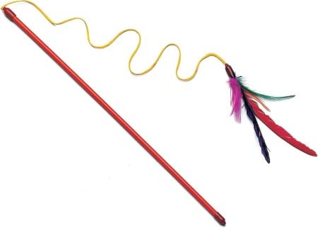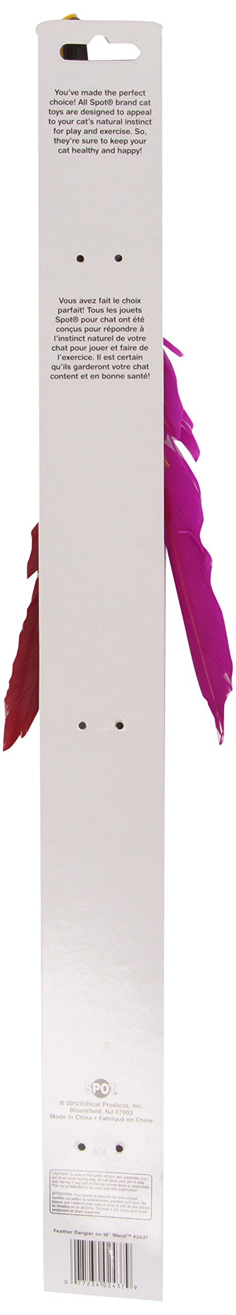 Q: What is the length of the Ethical Pet Feather Dangler Cat Toy?A: The Ethical Pet Feather Dangler Cat Toy features a wand that is 18 inches long, providing ample reach for engaging playtime with your cat.