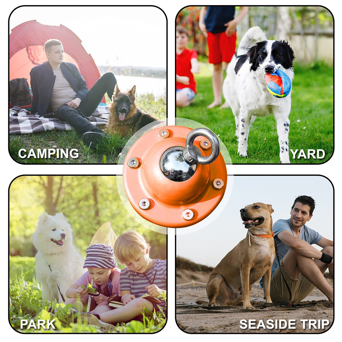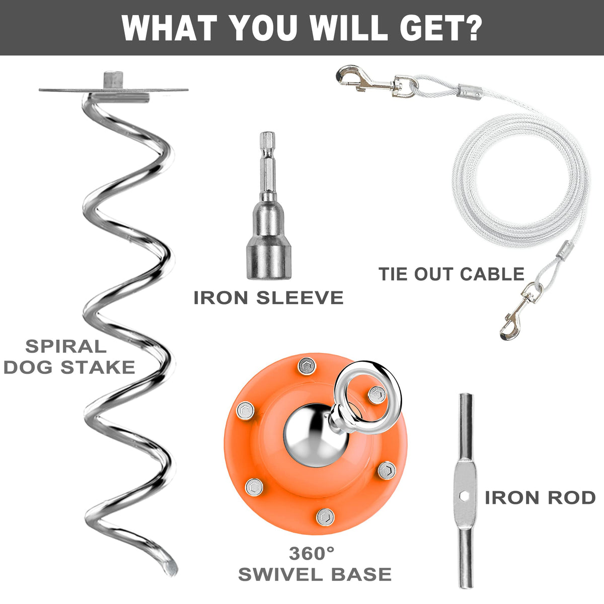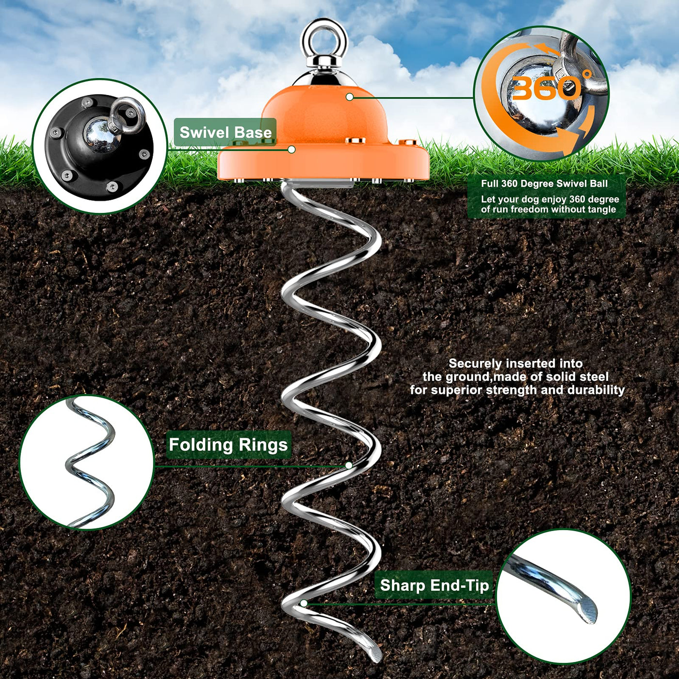 Convenient Outdoor Companion: Whether you're hosting a backyard barbecue, going on a camping trip, or enjoying a day at the park, our dog tie-out stake is a convenient companion.Give your dog the freedom to explore while ensuring their safety and preventing them from wandering off. | Solid and Durable: Crafted from powder-coated solid steel, this dog stake is built to withstand the elements and your dog's energetic movements. | 360-Degree Swivel Ring: Our Heavy Duty Dog Tie Out Stake is equipped with a 360-degree swivel ring, ensuring tangle-free movement for your dog while maintaining their safety and security. providing peace of mind for both you and your pet. | Secure Installation: Easily install it by anchoring it into the ground.Full spiral design allows the anchor's blade to provide maximum force resistance, while the curved spiral blade enables it to effortlessly glide through various soil types. This ensures that your dog won’t be able to bend or pull the stake out of the ground. | Versatile Use: Use it in your yard, take it to the park, or bring it along for camping adventures—this dog anchor is versatile and adaptable to various outdoor settings.