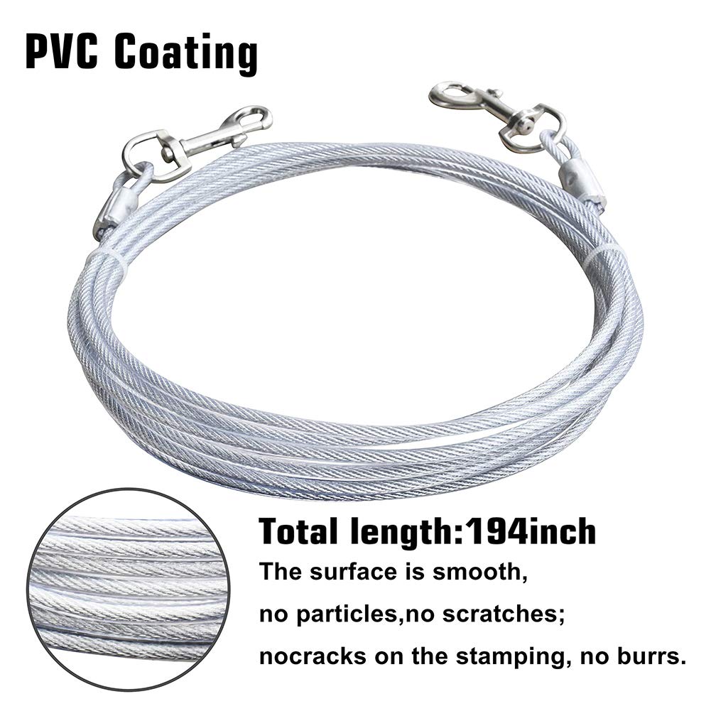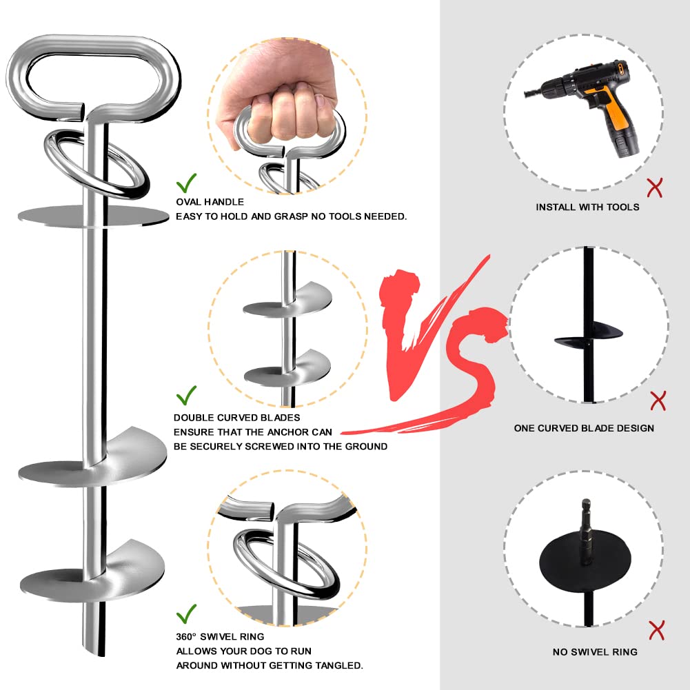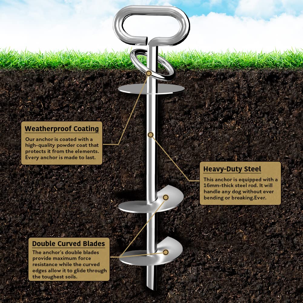 HEAVY DUTY:Made of powder-coated solid steel strong and rustproofThe 16mm-thick rod is sturdy enough to handel medium or large dogsThe double curved blades help to maximize the force resistanceThe superior durability of this stake can prevent your dogs from escaping FREE HANDS:Our heavy duty tie-out stake dog anchor allows your dog to roam around safely in the yard or go out to the park or for camping while you could have a spare time to do something else you wanna do 360A SWIVEL RINg:This stake has a 360-degree swivel ring to prevent your dogAs tie out to be tangled Even multiple pets simultaneously and continue to stay tangle free The swivel loop is easy to attach dog tie out cable EASY TO INSTALL: Sharp end-tip design you can inserted the tip into the ground easily Hold the handle and screw the stake into the deep groundThe double curved edges allow it to glide through the thoughest soilTighten the stake until it can not be screwed down and then buckle the cable on the ring of the stakeBonus 17FT Dog Tie Out cable MULTI-USAgE:Suit for grassland soil sand field and riversidePerfect choice to anchor down trampolines tents tarps canopies car ports or other outdoor covers playground equipment