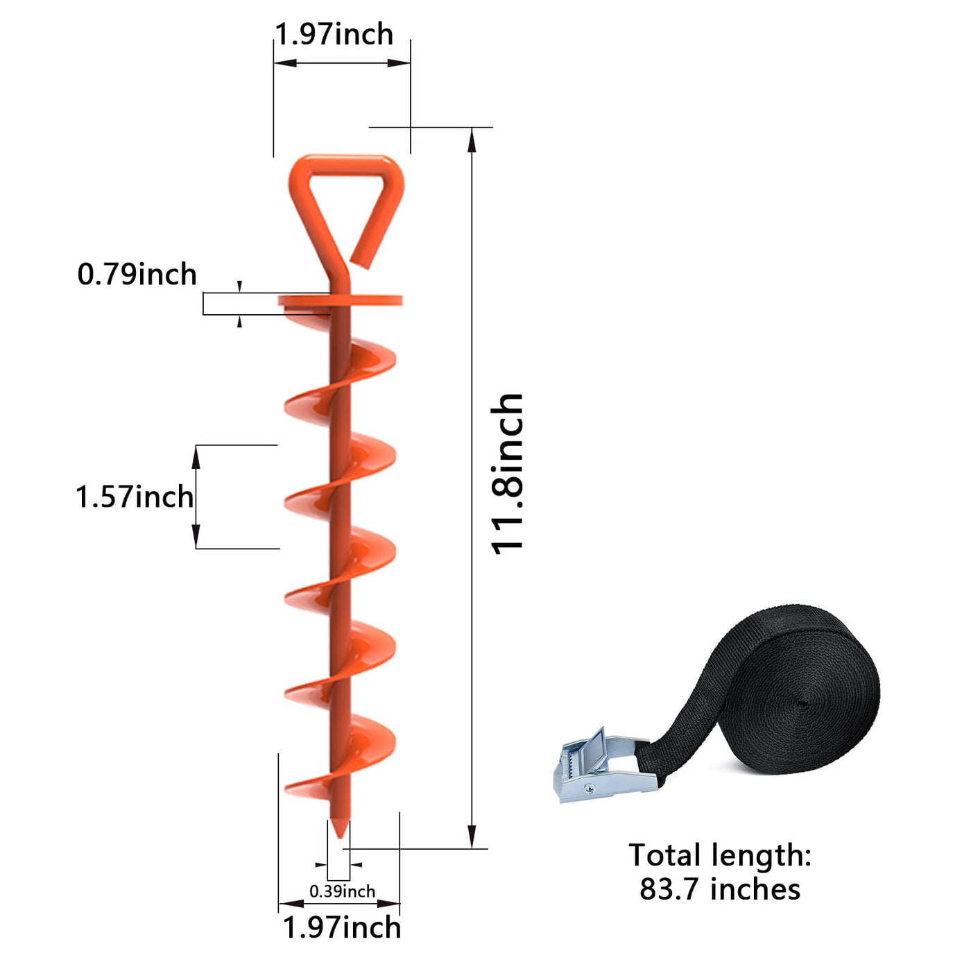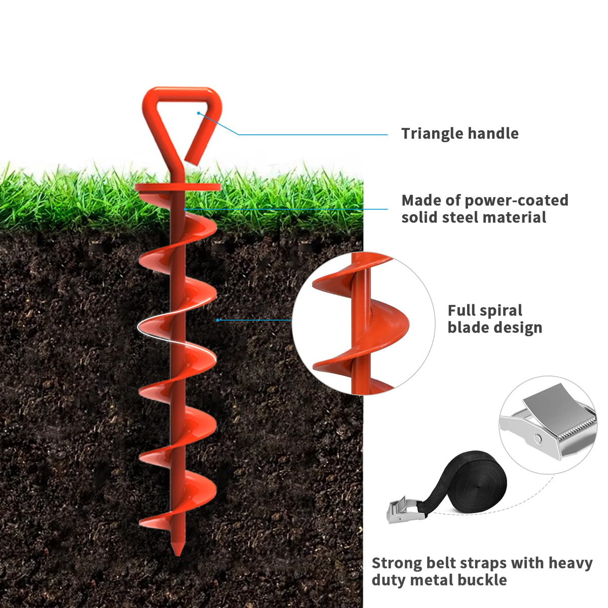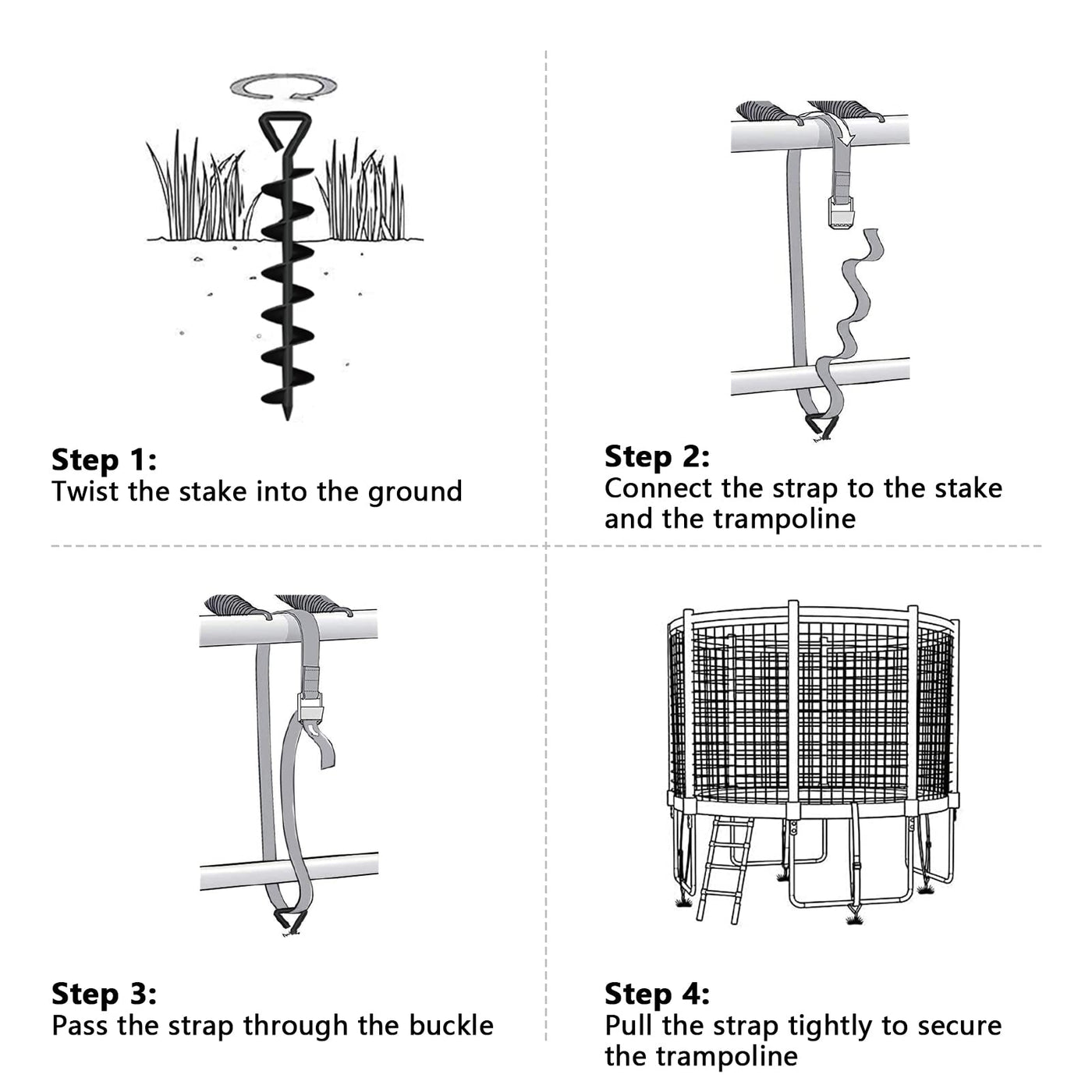 Durability and Strength:Made of high-quality solid steel,thick black powder coating on the surface makes it rust-proof for long-term use,ensuring they are durable and can withstand various weather conditions and the strain of regular use. | Easy to install:No tool needed.Tough strong belt straps perfectly connects the stakes with your trampoline.Fastening the straps is an important step after twisting the stake into the ground.This means our trampoline stakes can be quickly set up to enhance safety. | Enhanced Stability: Can anchor the trampoline to the ground, significantly increasing its stability. This canopy stake is especially important in windy conditions, as it prevents the trampoline from tipping over or being blown away. | Bonus Belt for Additional Security:Provides an extra layer of security. It wraps around the trampoline frame, connecting it more securely to the stakes and ensuring even greater stability. | Multiple Applications: Perfect for securing trampolines, tents, tarps, canopies, carports, and dog tie-outs.