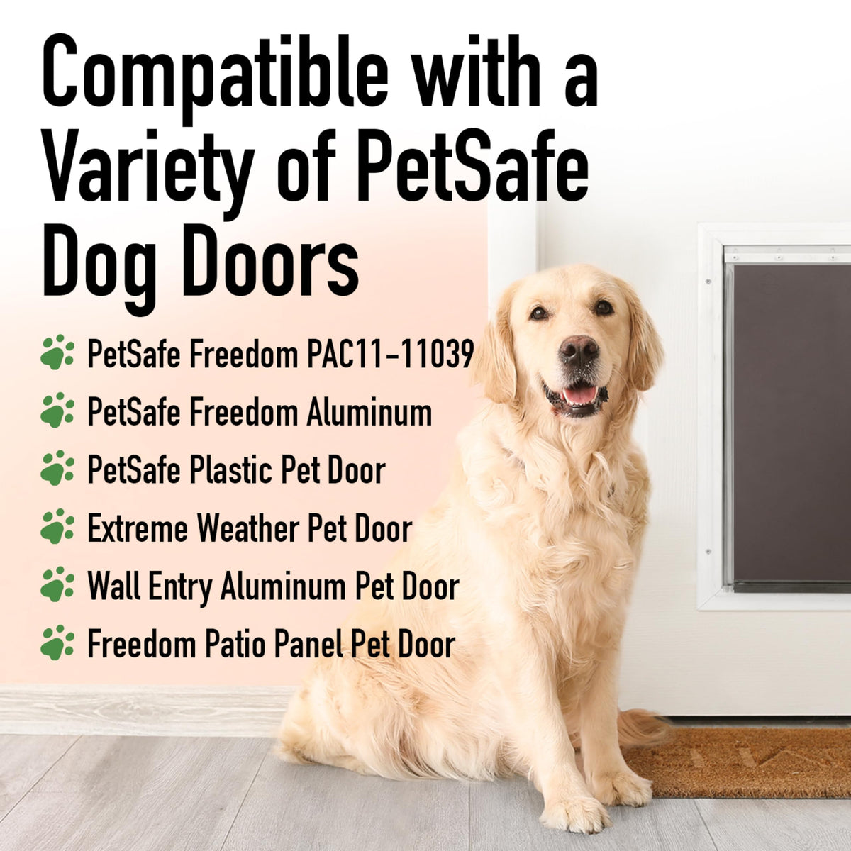 Q: Is the Evergreen Pet Supplies Large Replacement Dog Door Flap compatible with all PetSafe doors?A: Yes, this replacement dog door flap is designed to be compatible with various PetSafe doors, including the PetSafe Freedom Aluminum, Plastic Pet Door, Extreme Weather Pet Door, Wall Entry Aluminum Pet Door, and the Freedom Patio Panel Pet Door.