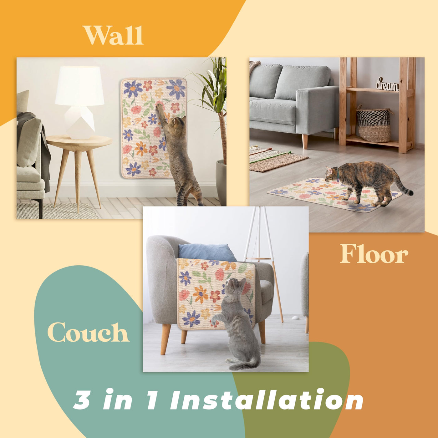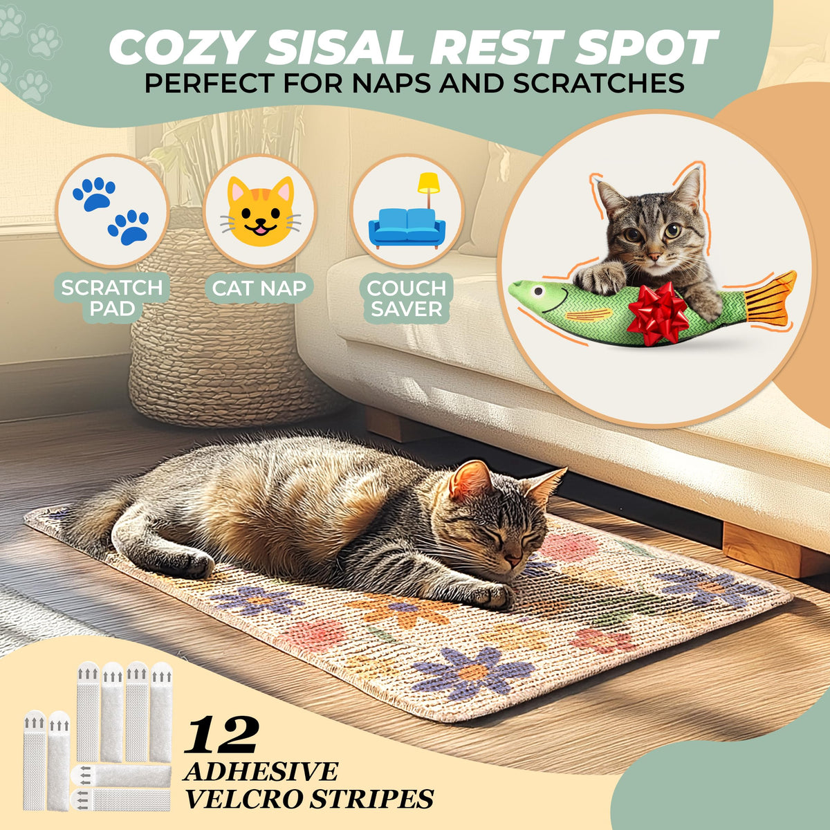 Evomotive Scratchable Sisal Cat Scratcher, [+ Catnip Fish Toy], Wall Scratcher, Couch Protector, Scratching Mat- 24 X 15.8 With