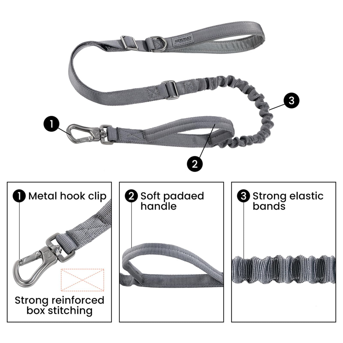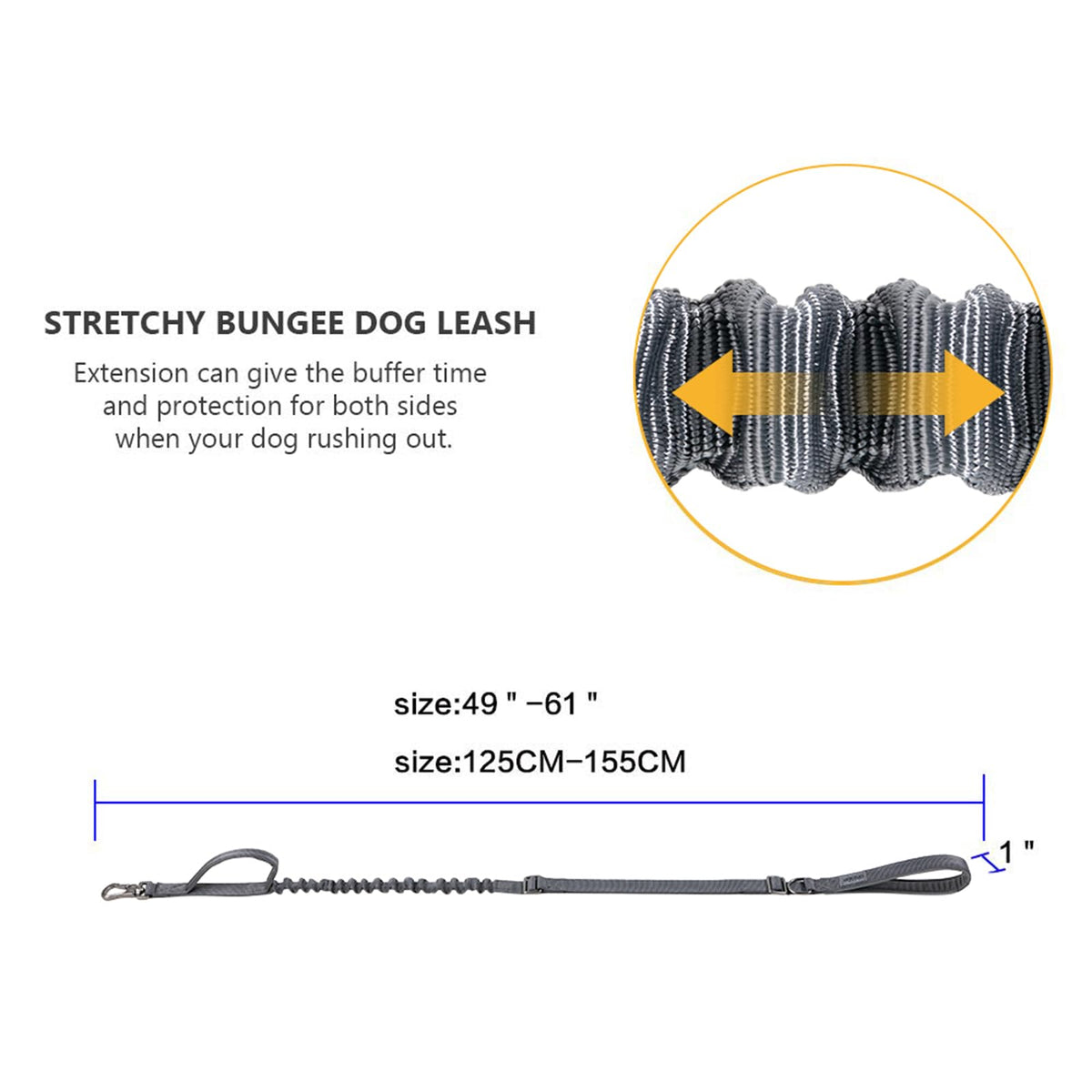 Q: How does the bungee feature of the leash work?A: The bungee design provides elasticity, allowing for sufficient stretching force that helps absorb shock and gives buffer time when your dog rushes out, ensuring a more comfortable experience for both you and your pet.