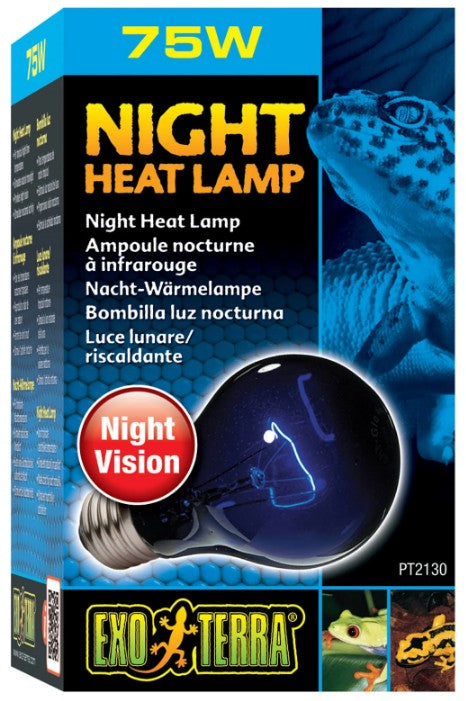The Exo-Terra Night Heat Lamp Reptile Bulb Features Blue Glass To Simulate Natural Moonlight Without Altering Natural Day Length Or Photo Period. This Is A Great Way To View Your Reptiles Natural Nocturnal Activities Without Causing Interruption!Simulates Natural Moonlight For Nocturnal Viewingpromotes Normal Digestion, Breeding Behaviors And Other Healthy Activitiesmaintains Tropical Night Time Temperaturesthis Lamp Features A Neodymium Sleeve And Emits A Bluish Light That Will Not Disrupt Your Reptile Or Amphibians Day/Night Cycle. Heat Emitted Is Minimal, But Still Enough To Replicate Tropical Night Temperatures. The Low Wattage Does Not Interfere With Natural Night Drops In Temperature.Tip: Combine With Exo Terra Daytime Heat Lamp Or Repti Glo To Create A 24-Hour Cycle. Formerly Known As The Night Glo Moonlight Lamp.Note: This Lamp Does Not Provide Uvb.