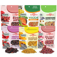 This treat assortment contains six popular treats for herbivores (plant eaters) combined into one fantastic assortment.INCLUDES: Herbivore Treat 3 oz.Rose Hip Treat 3 oz.Veggie Blend 3 oz.Hibiscus Flowers 0.92 oz.Calendula Flowers 0.42 oz.Rose Petals & Buds 0.63 oz.FEATURES:? VARIETY - Offer a different treat every day! Lends variety to an otherwise monotonous diet? FORAGING - Small size enables you to put in toys to encourage natural foraging behavior? HERBIVORES - Suggested for: squirrels, guinea pigs, rabbits, chinchillas, prairie dogs, degus, hamsters, gerbils and other herbivores.? ENRICHMENT - Adds behavioral enrichment for animals that spend their lives in a small, limited environment? BONDING - Forms a connection between pets and pet owners? TRAINING - Helps in training your pet to come when called ? DENTAL HEALTH - Provides good exercise for teeth and jaws.FEEDING RECOMMENDATION: These products are treats and should be fed sparingly, they are not a substitute for a regular, balanced diet. Offer treats 2-3 times per week or as a small portion (less than 20%) of the main diet. Treats may lead to health issues like obesity when overfed. If your pet is not consuming its regular balanced diet, withhold serving treats until stable eating habits resume.