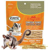 Exotic Nutritions Omega Yums is a popular fish stick treat for small pets.SIZE: 18 gramsFEATURES:NUTRITIOUS - Variety of protein & calcium for Sugar Gliders, Hamsters, Squirrels, Hedgehogs, Chinchillas, Rabbits, Ferrets, and more.HEALTHY FUR - Omega nourishes the fur, making it look shinier. Benefits teeth and gums as well!HEALTHY - A healthy, natural treat for pets specially fortified with vitamins and mineralsVARIETY - Lends variety to an otherwise monotonous diet ENRICHMENT - Adds behavioral enrichment for animals that spend their lives in a small, limited environmentBONDING - Forms a connection between pets and pet ownersDENTAL HEALTH - Provides good exercise for teeth and jawsFEEDING RECOMMENDATION: These products are treats and should be fed sparingly, they are not a substitute for a regular, balanced diet.